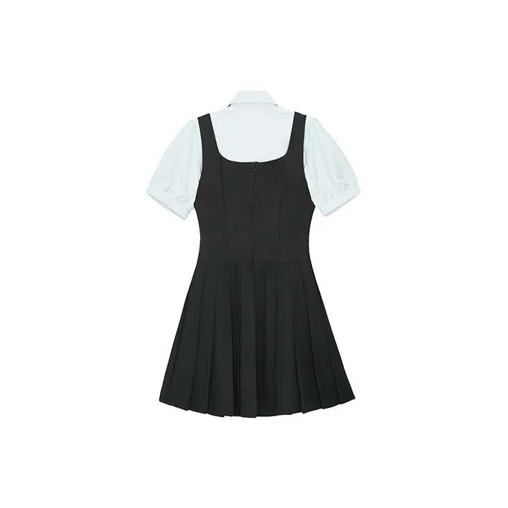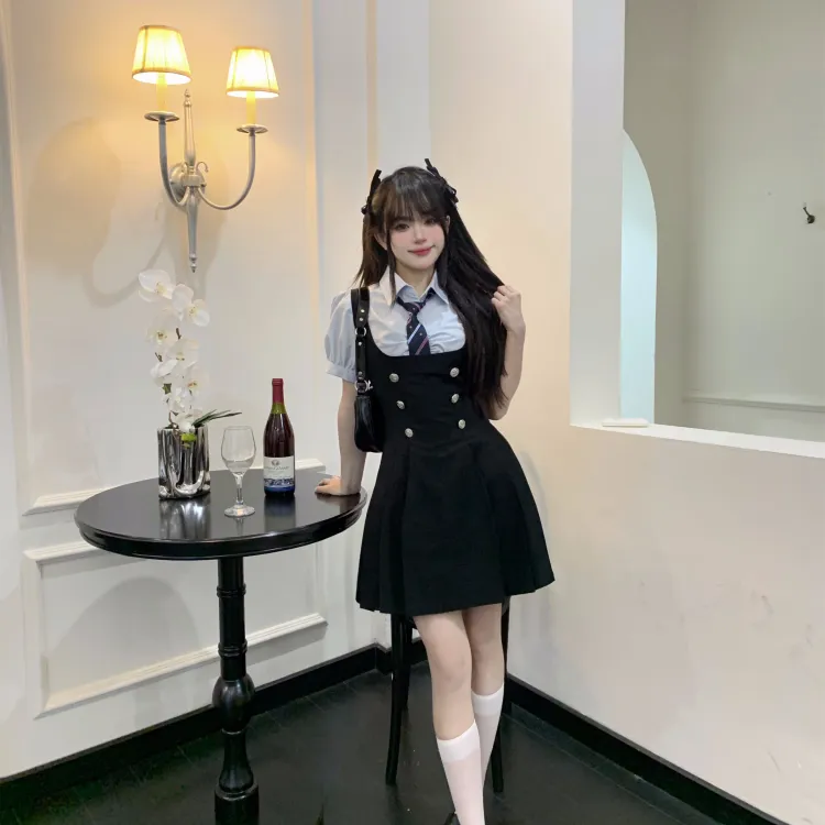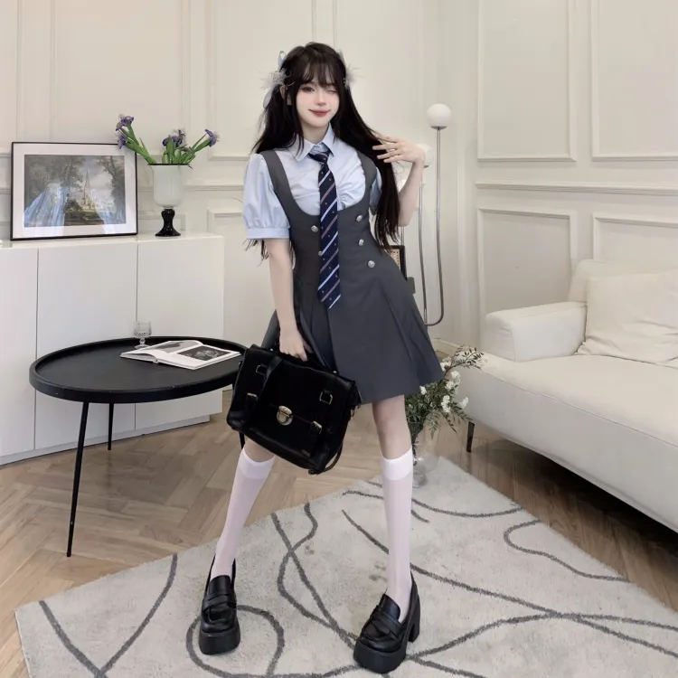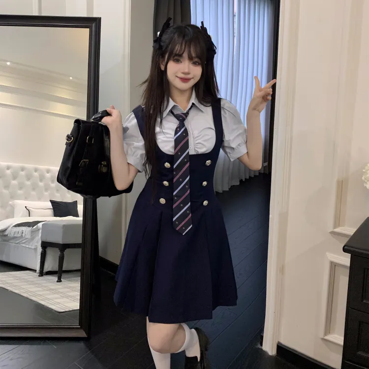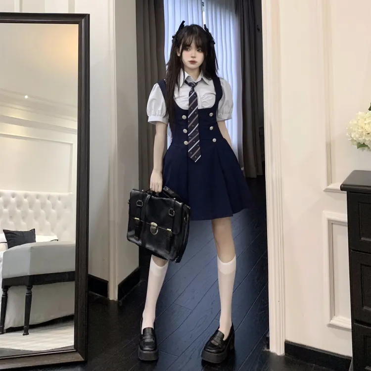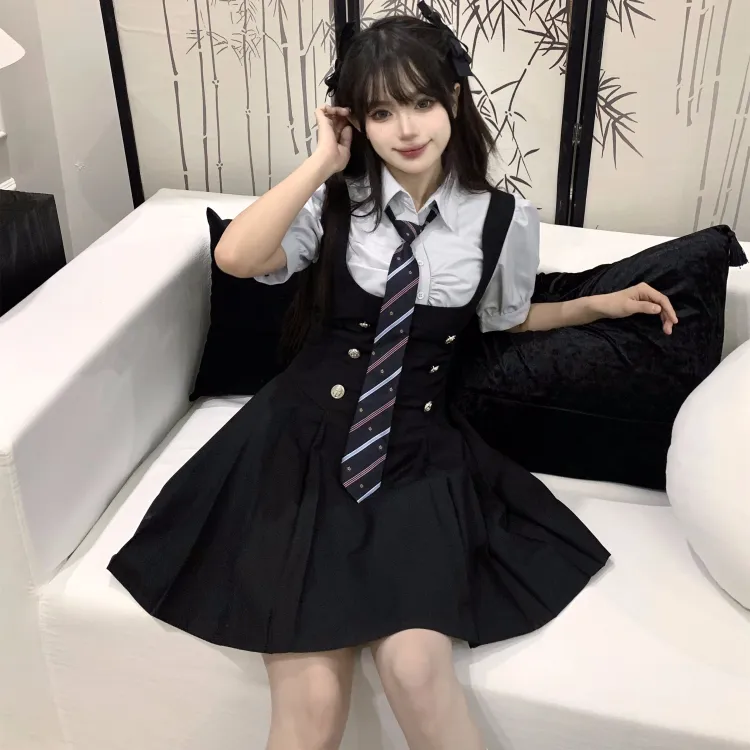 Комплект:Комплект (Синяя рубашка с коротким рукавом + черная юбка с поясом + синий галстук)