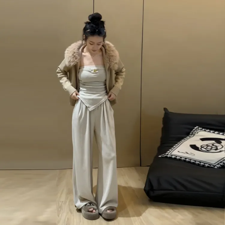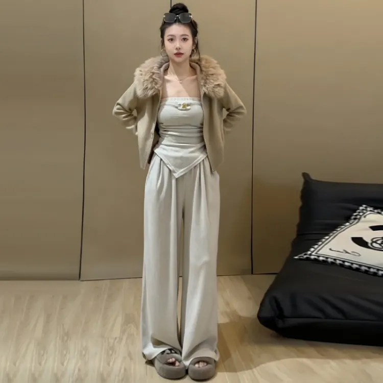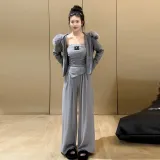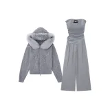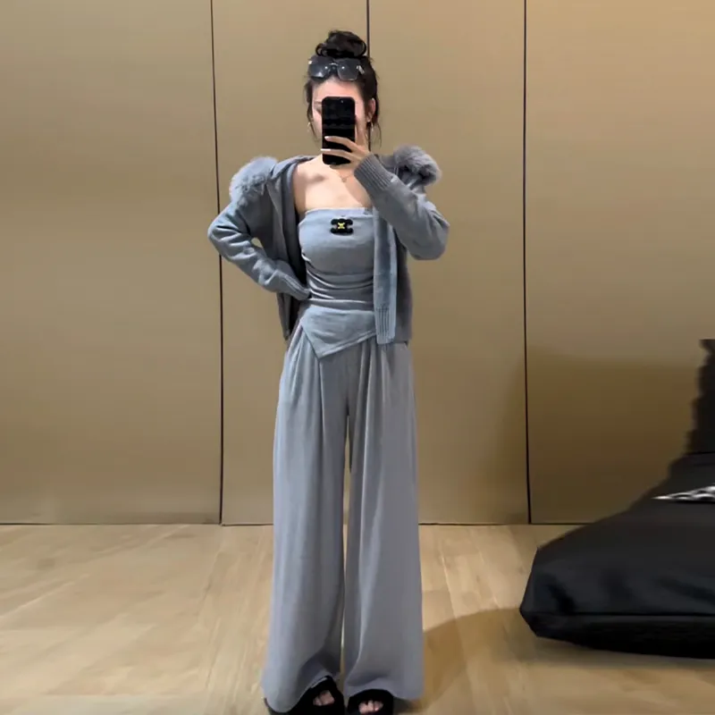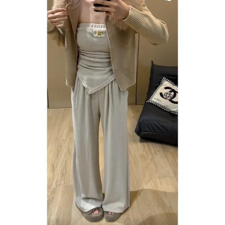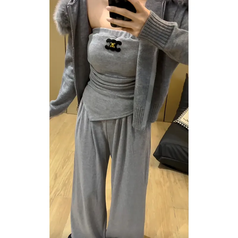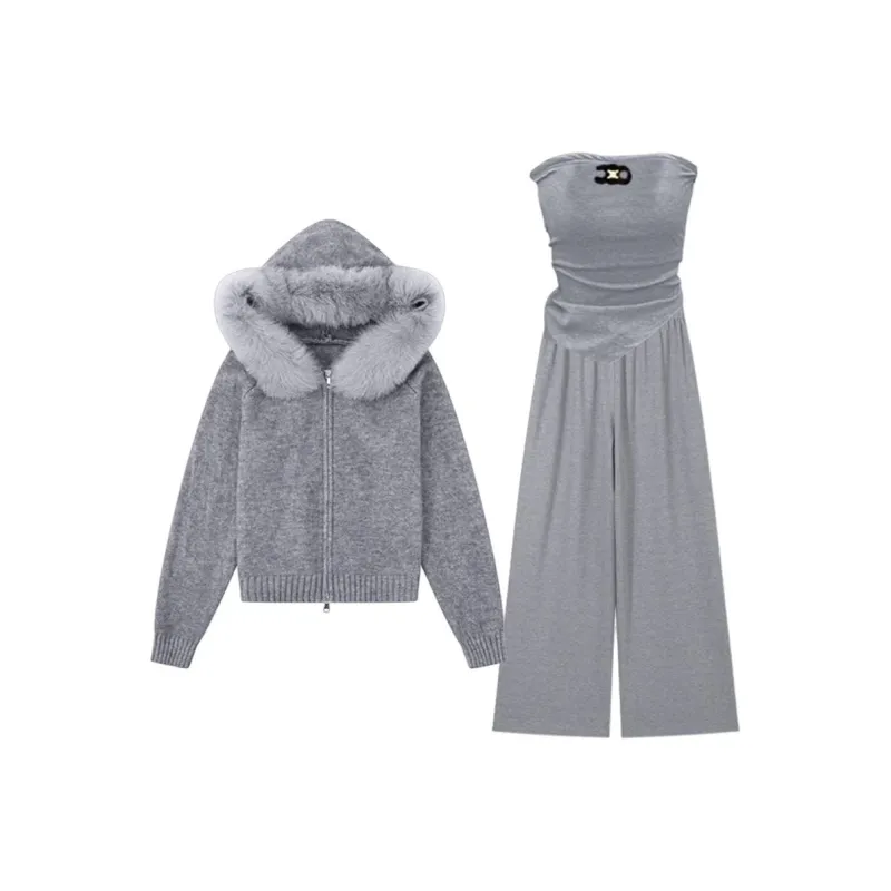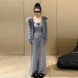 Комплект:Серое пальто + серый топ без бретелек + серые штаны