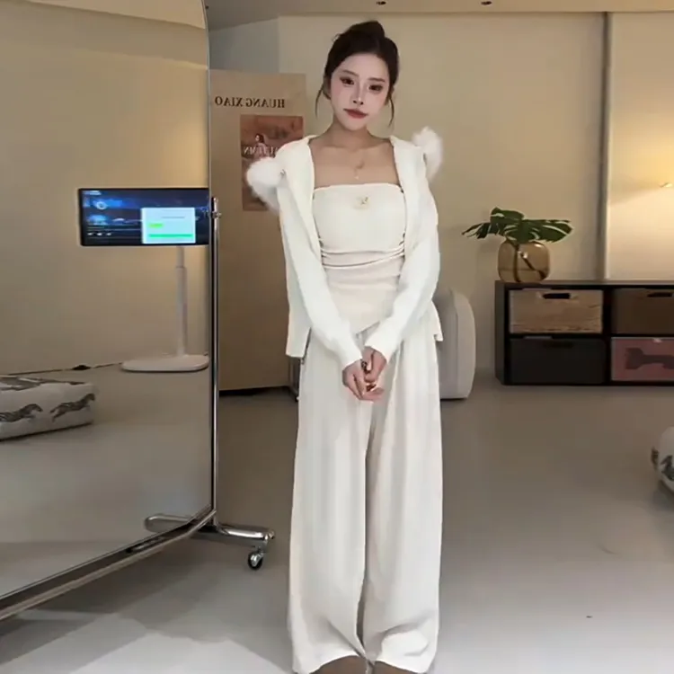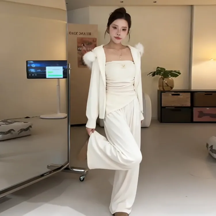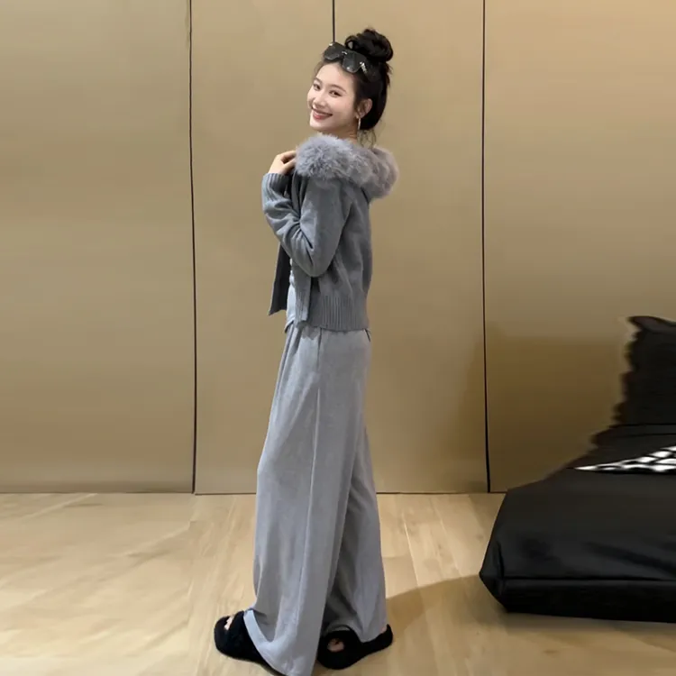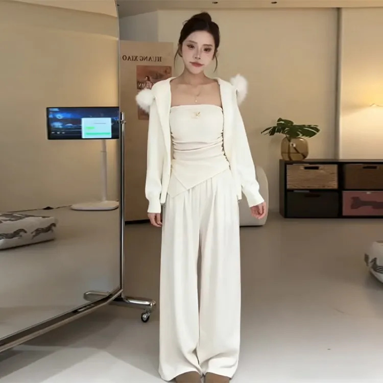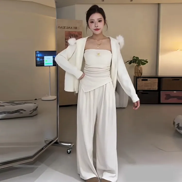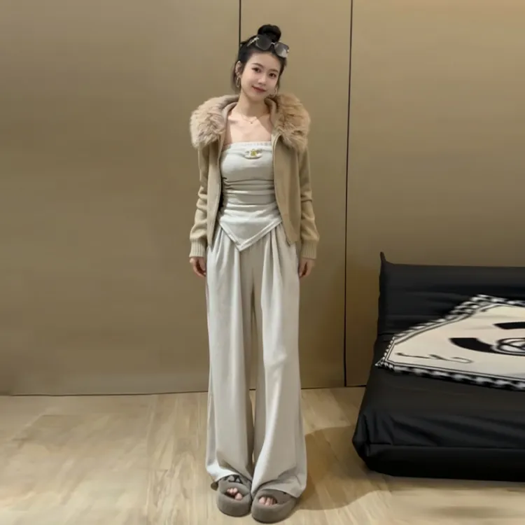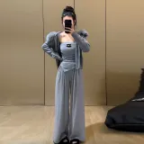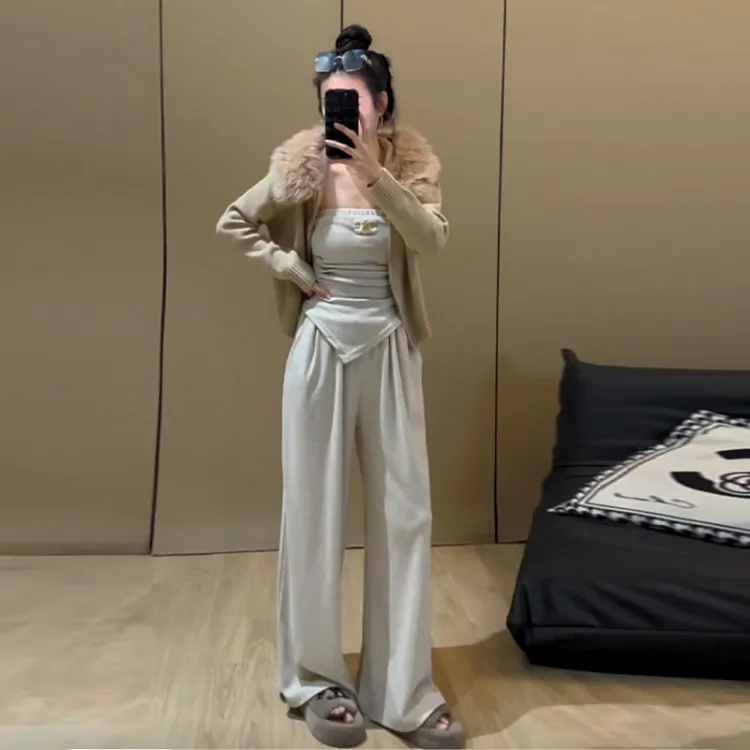Комплект:Серое пальто + серый топ без бретелек + серые штаны