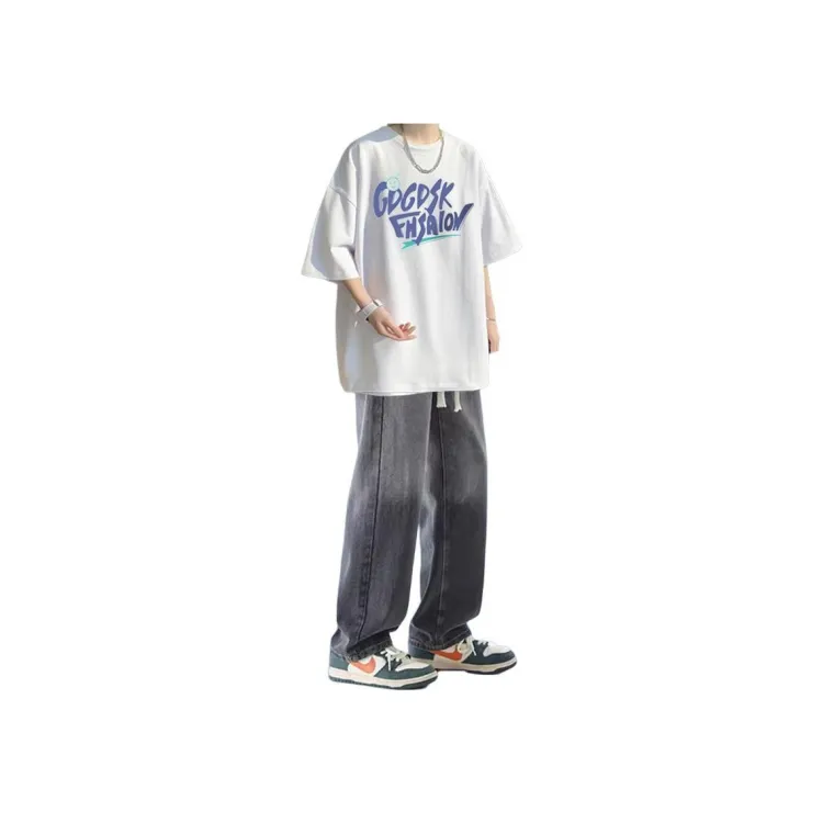 Белая футболка + черно-серые джинсы