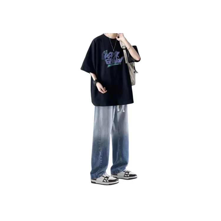 Чёрная футболка + синие джинсы