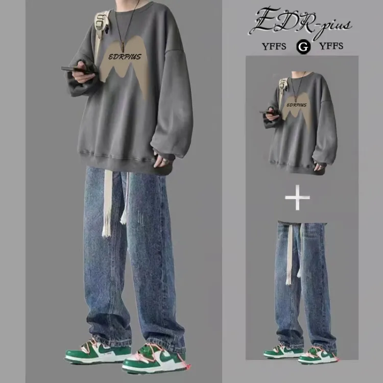 Темно-серый свитшот + синие джинсы