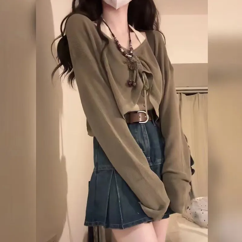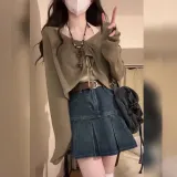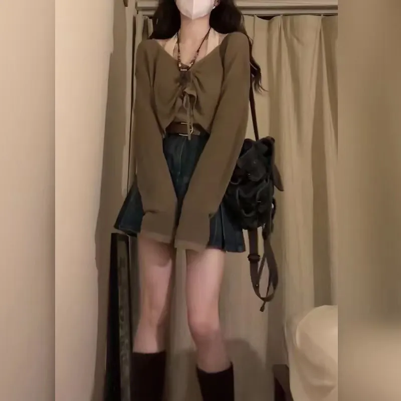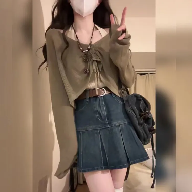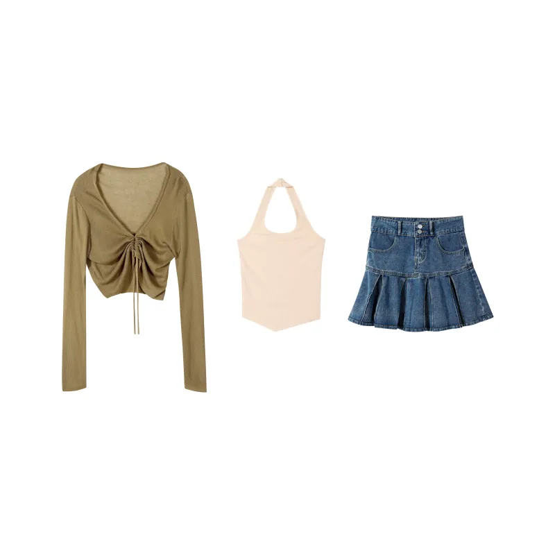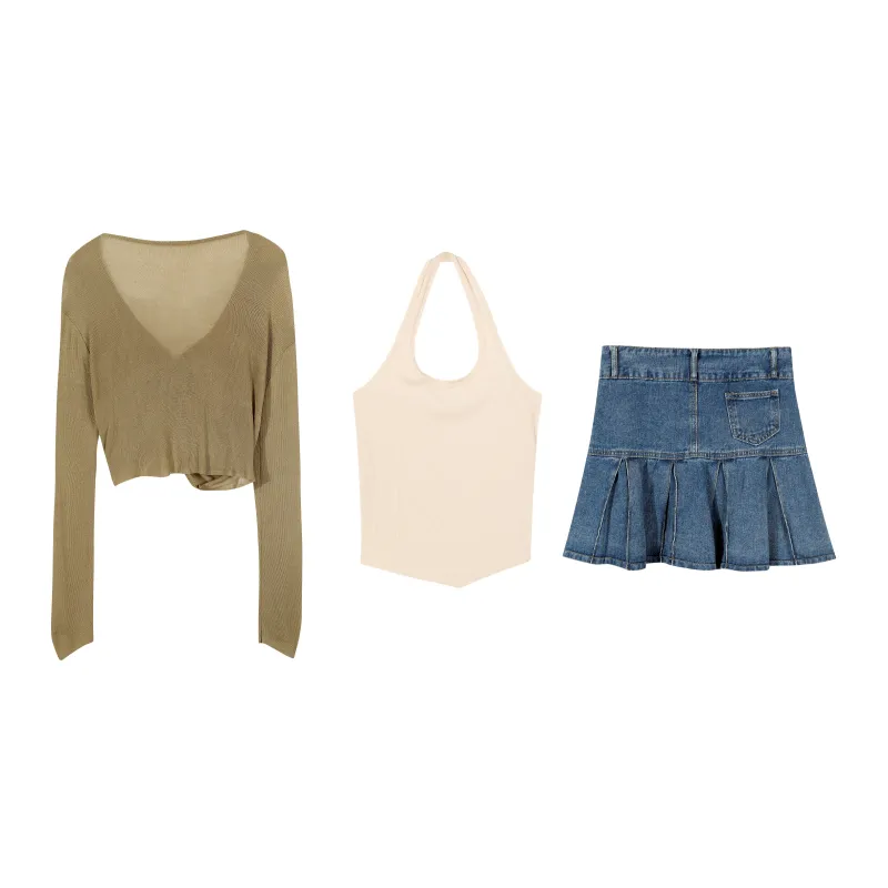 Одежда Набор (Кофейная накидка + Розовый топ на бретелях + Синяя короткая юбка)