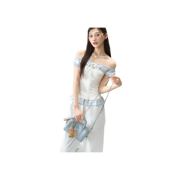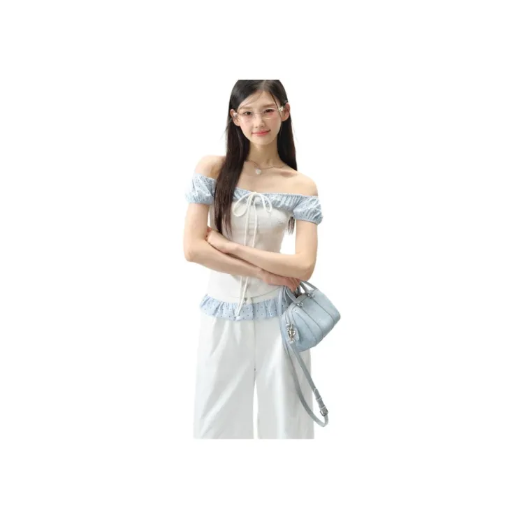 Синий Белый Гороховый Короткий Рукав
