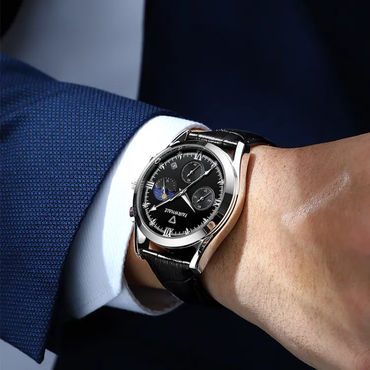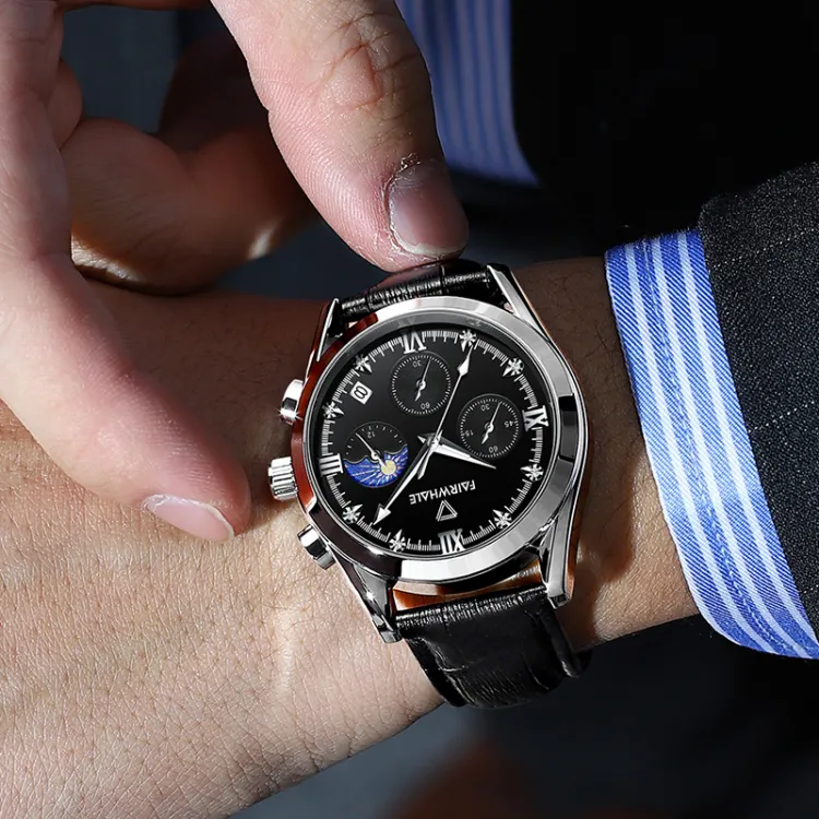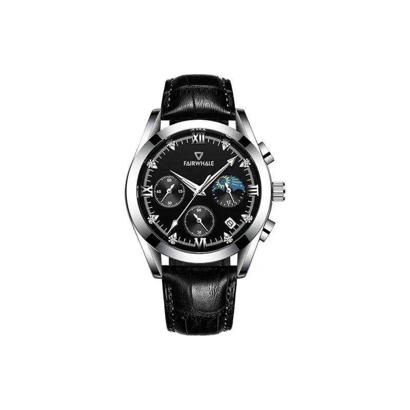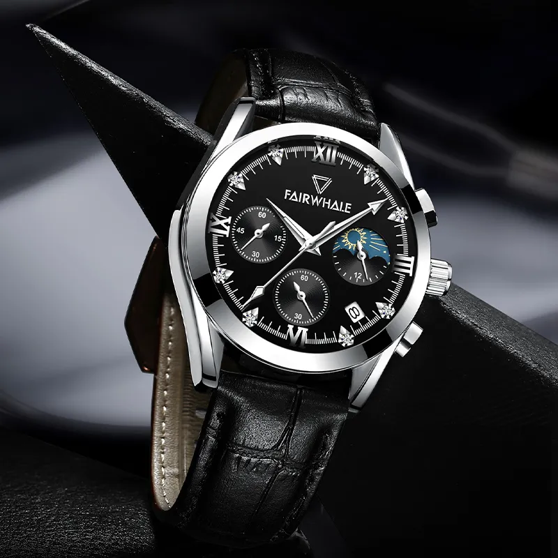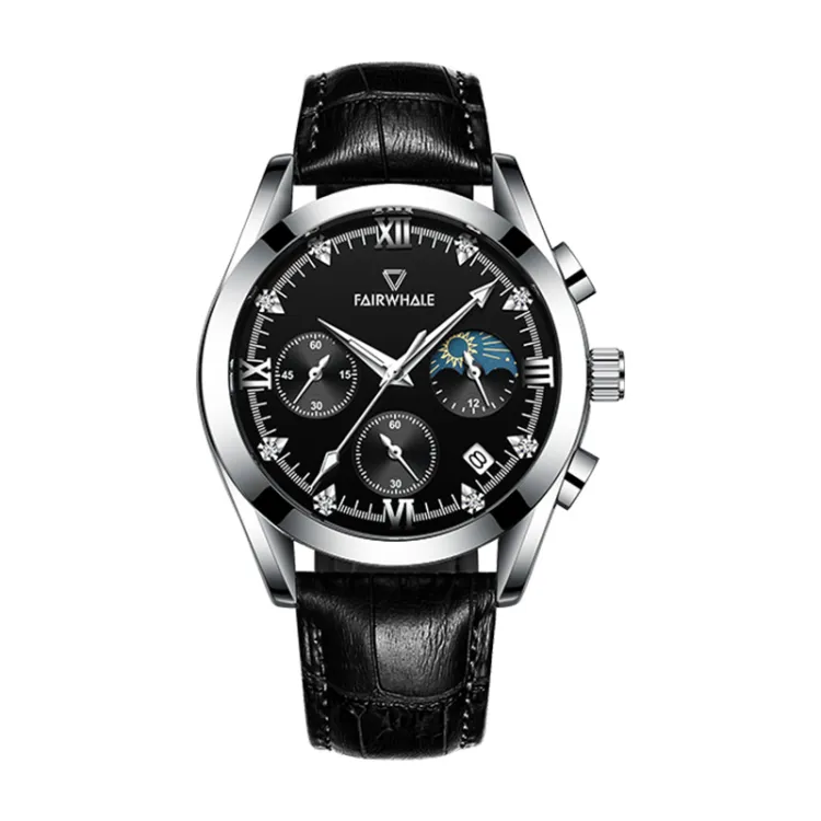 FAIRWHALE Driver Collection Кварцевый механизм Естественная кожа Ремешок Часы Мужские Черный циферблат