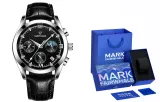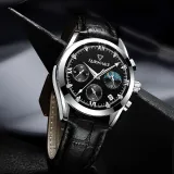 Комплект:Серебряный корпус, черный циферблат, черный кожаный ремешок