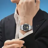 Серебряный корпус с черным циферблатом, серебряный стальной браслет.