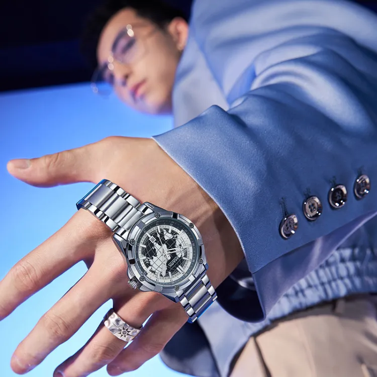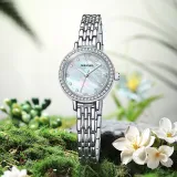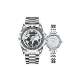 Циферблат Цвет:Серебряный корпус с черным циферблатом, серебряный стальной браслет (мужской) + серебристо-белый, циферблат с жемчужным, стальной браслет (женский)