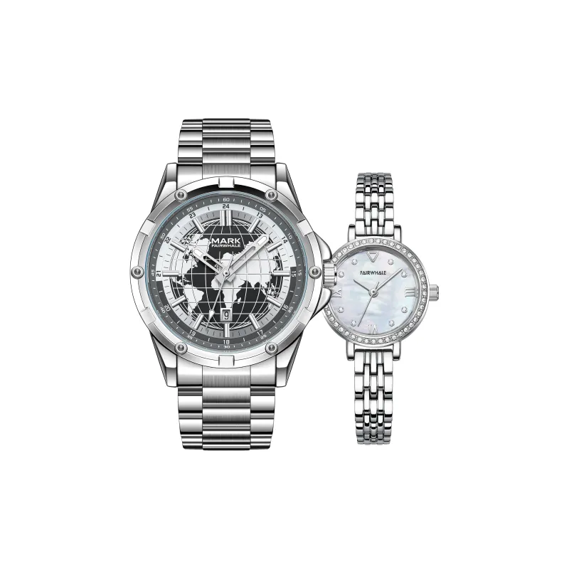 Серебряный корпус с черным циферблатом, серебряный стальной браслет (мужской) + серебристо-белый, циферблат с жемчужным, стальной браслет (женский)