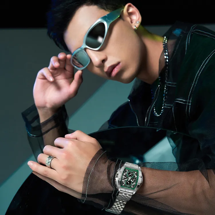 Серебряный корпус, зеленый циферблат, серебряный стальной браслет