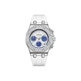Циферблат Цвет:Серебряный корпус с белым циферблатом, белый резиновый ремешок.