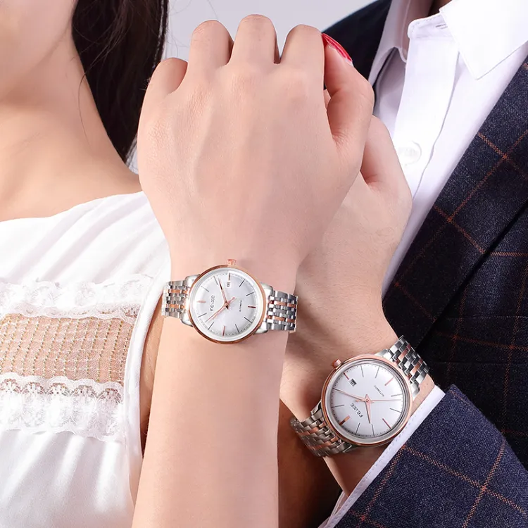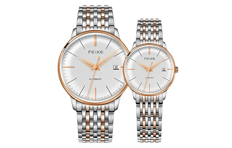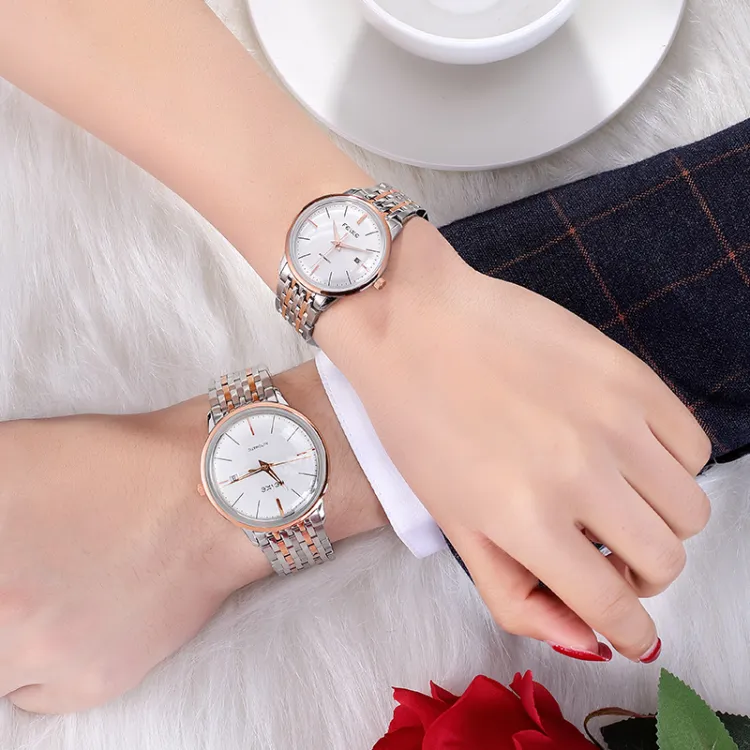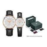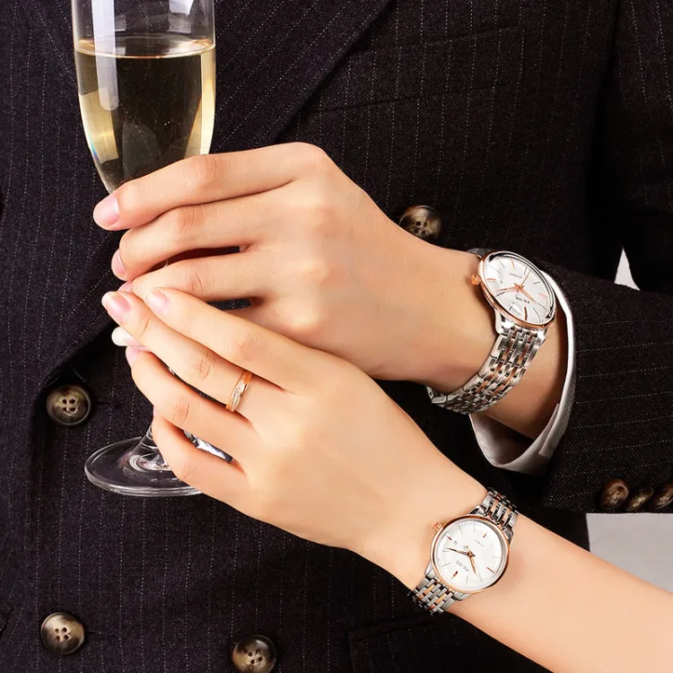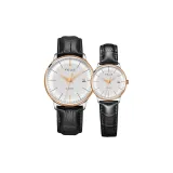 Спецификации:Золотое тело, белый циферблат, черный ремешок (парная упаковка, 1 пара)