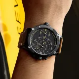 Чёрный корпус с чёрным циферблатом, коричневый ремешок