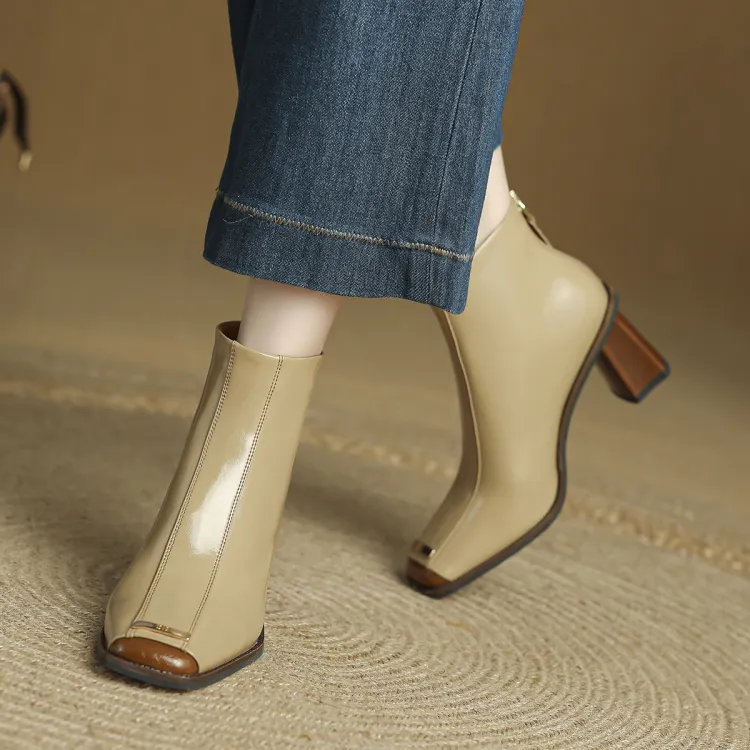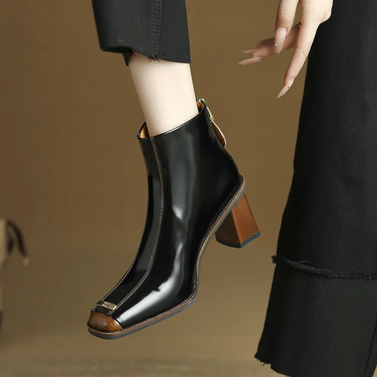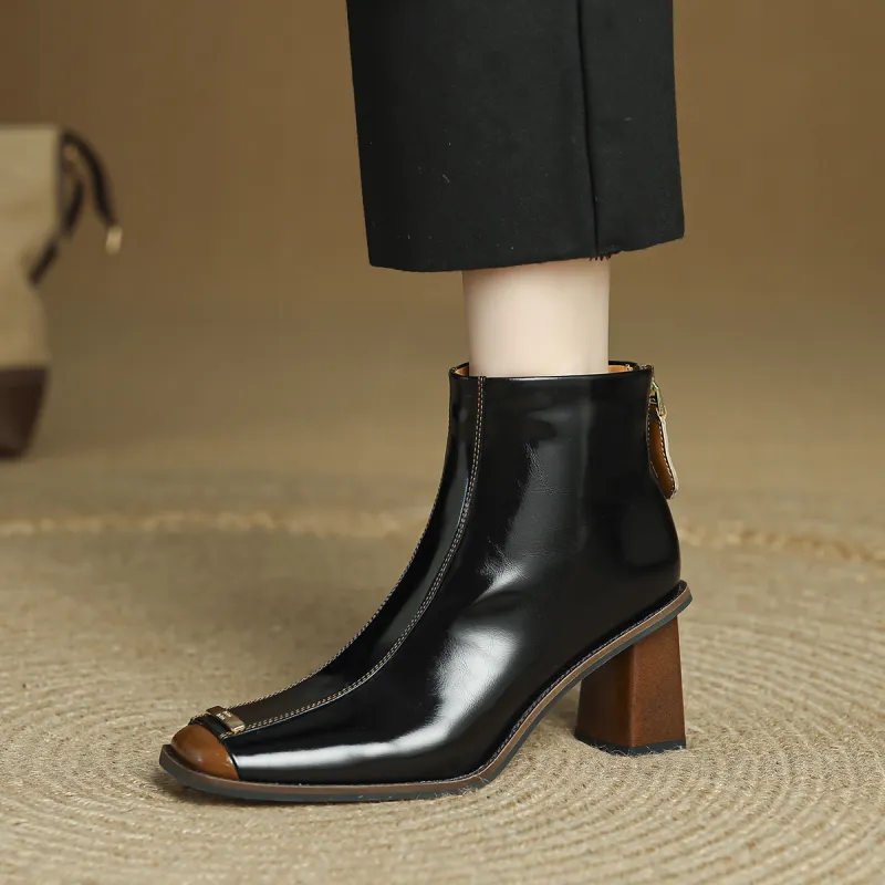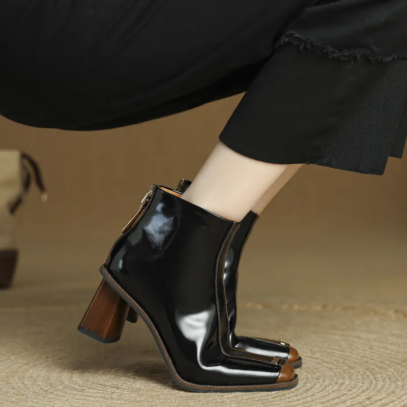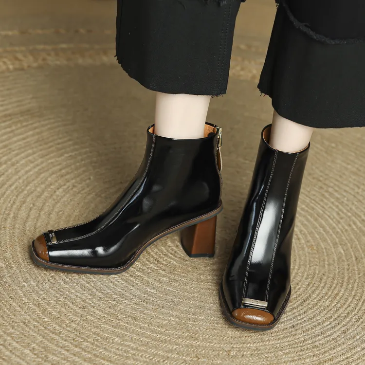 FMM Британский Цветовой блок 2025 Осенний Зимний Элегантность Высокий каблук Женские Квадратный носок Лакированная кожа Тонкий Ботинки Женские