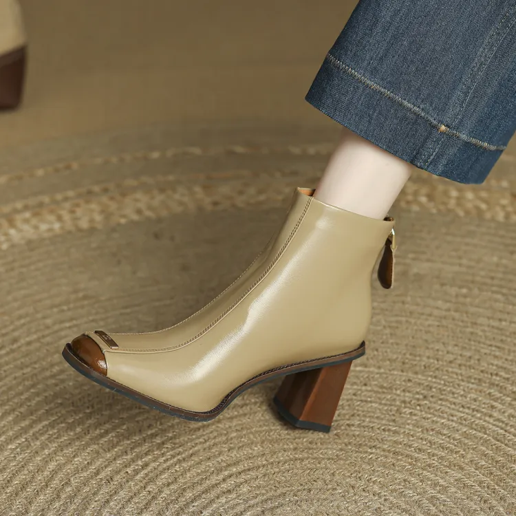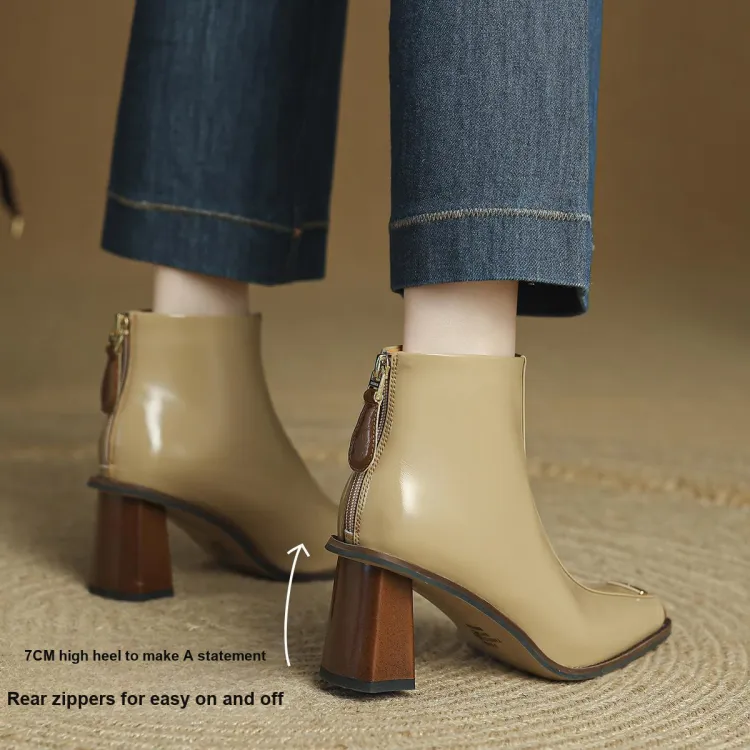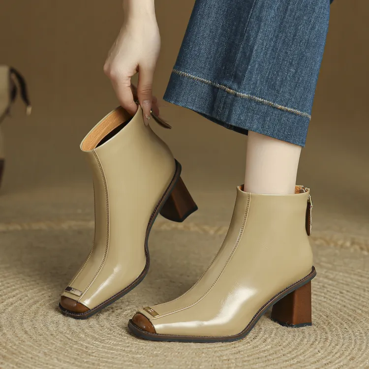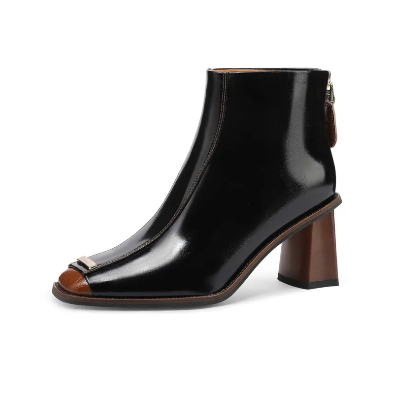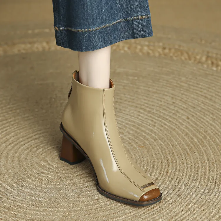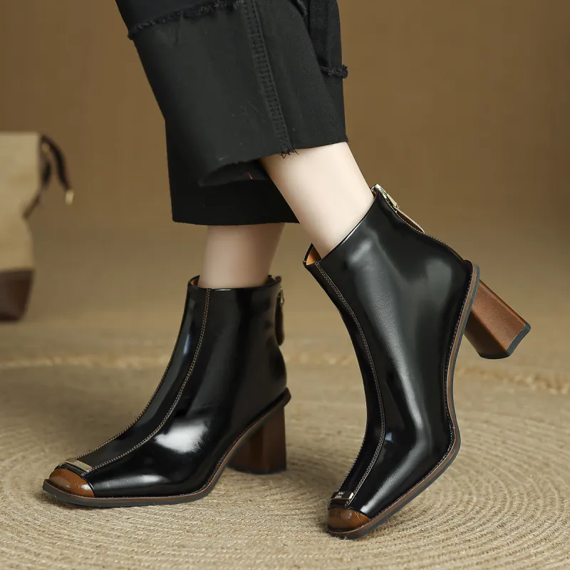 FMM Британский Цветовой блок 2025 Осенний Зимний Элегантность Высокий каблук Женские Квадратный носок Лакированная кожа Тонкий Ботинки Женские