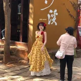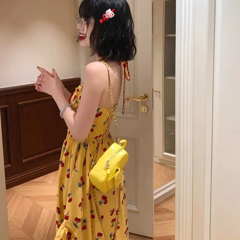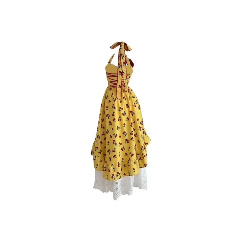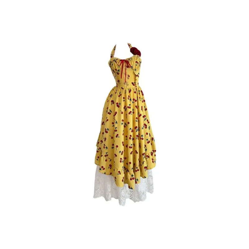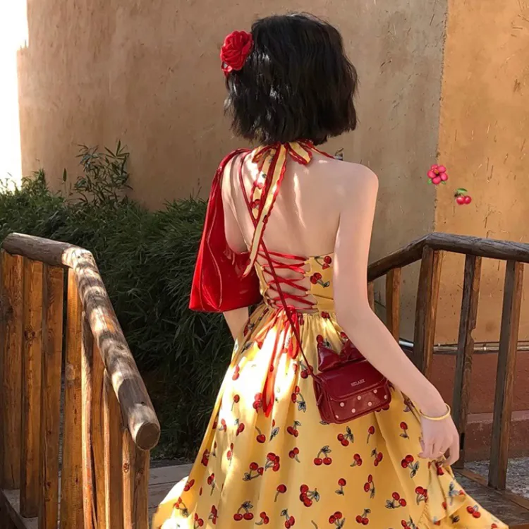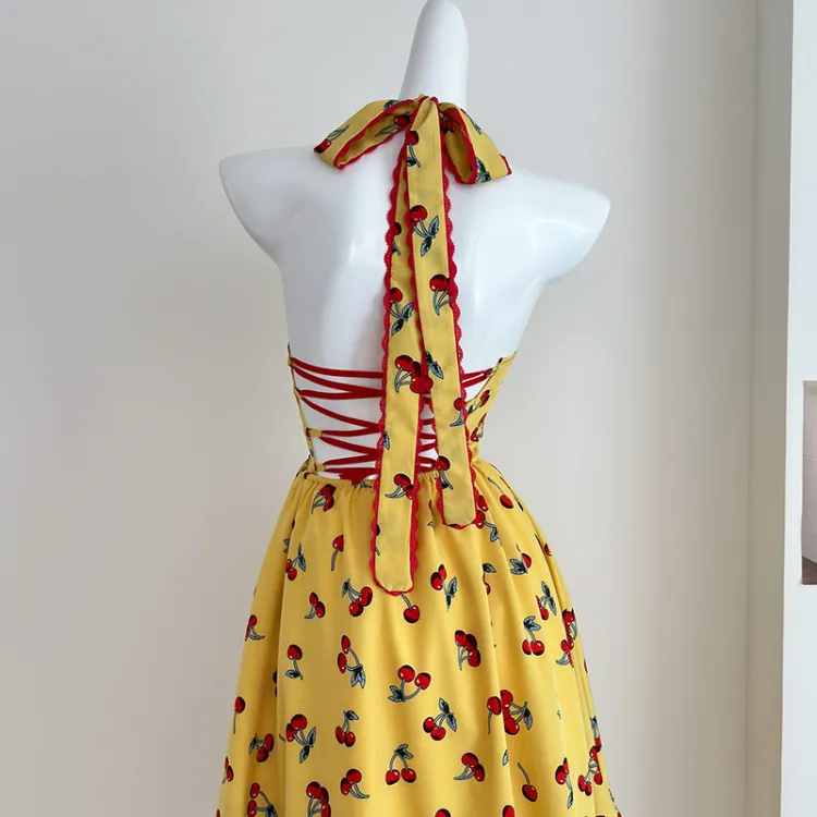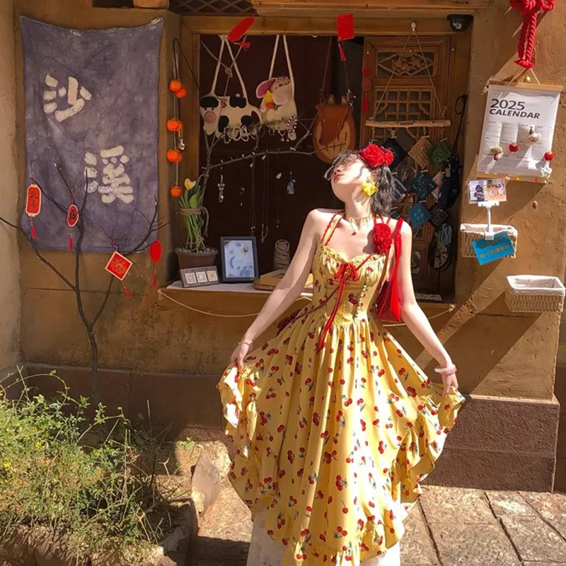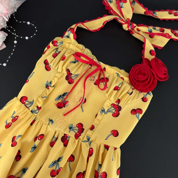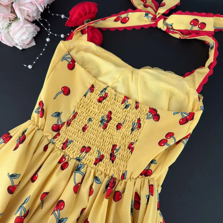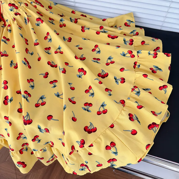 Желтое платье-камзол с узором "вишня" + юбка