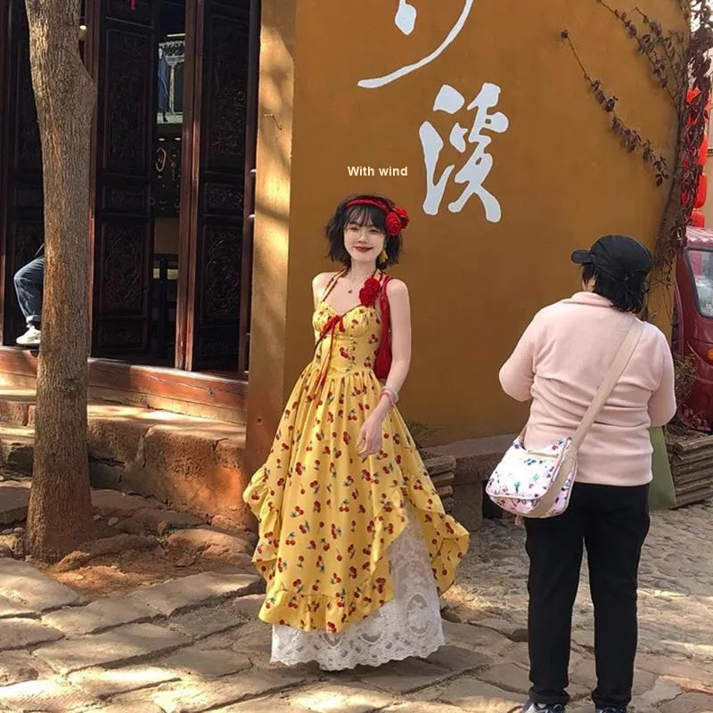 Комплект:Желтое платье-камзол с узором "вишня" + юбка