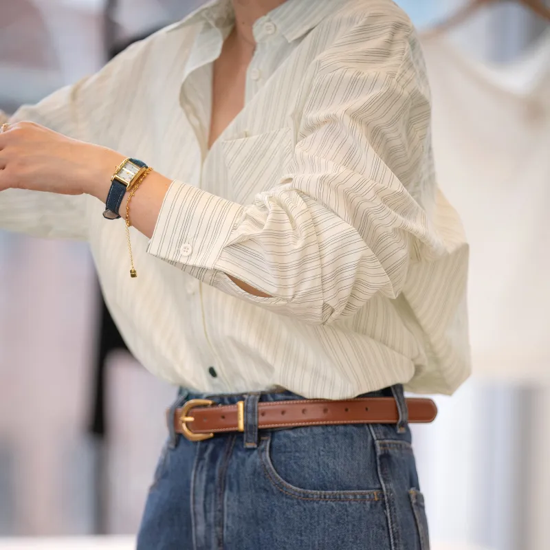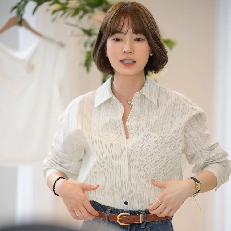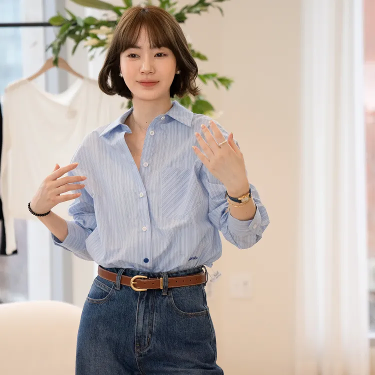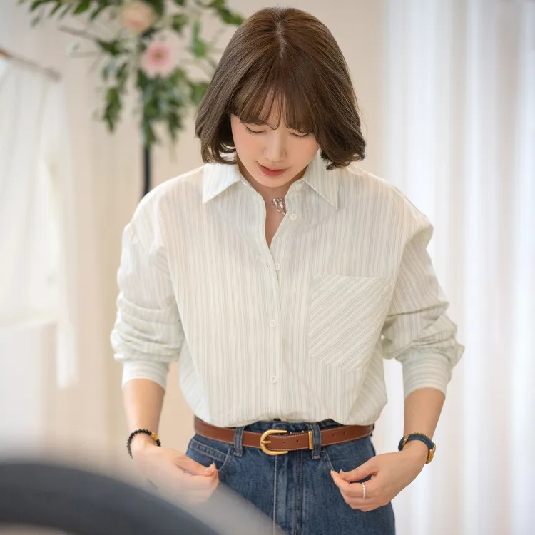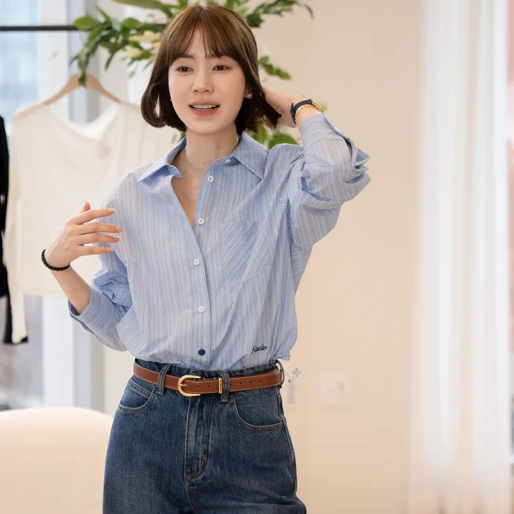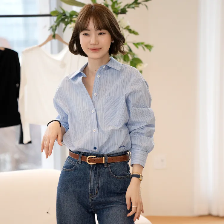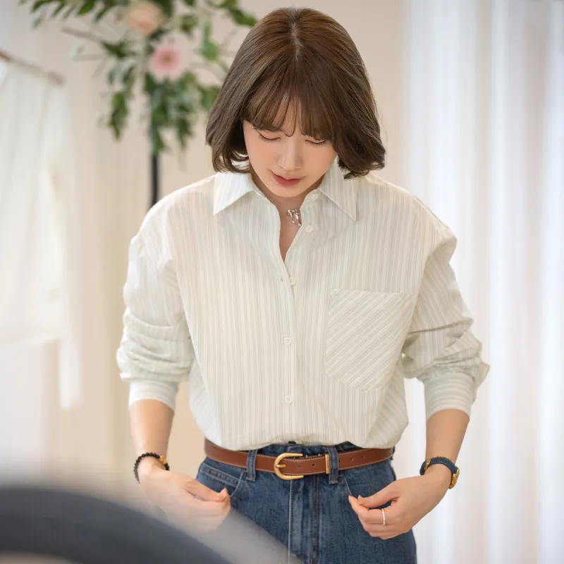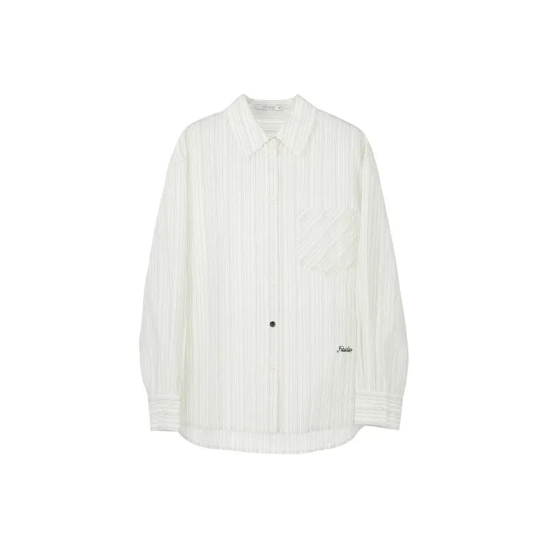 Fstudio Корейский стиль Преппи стиль Универсальный Длинный рукав Полосы Рубашка Женская