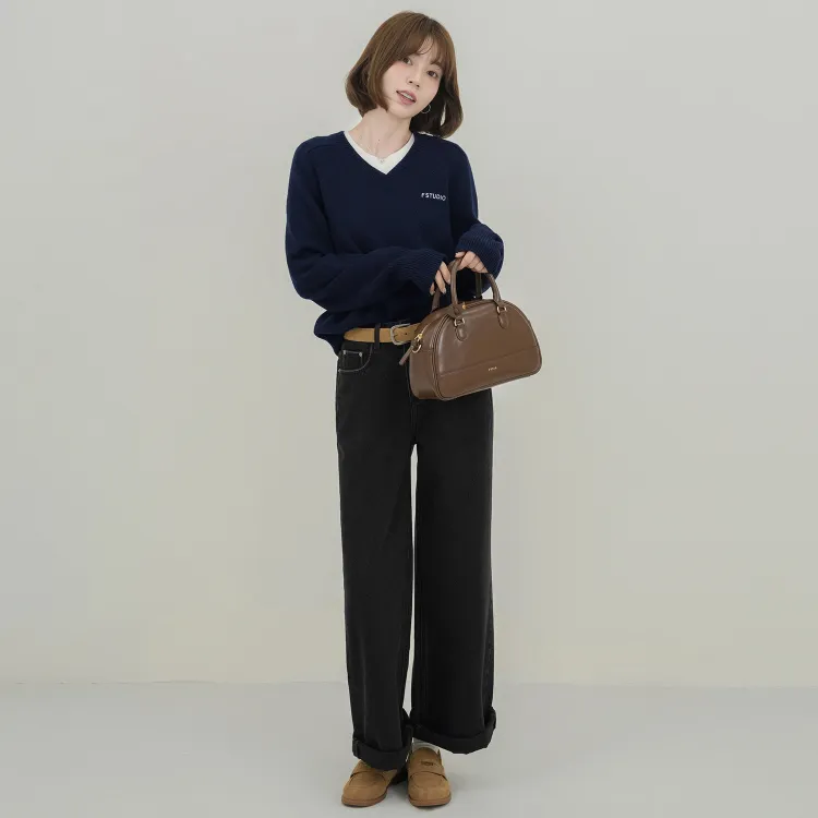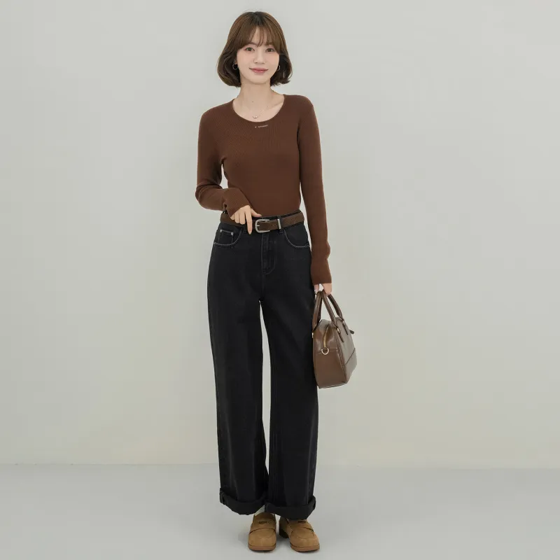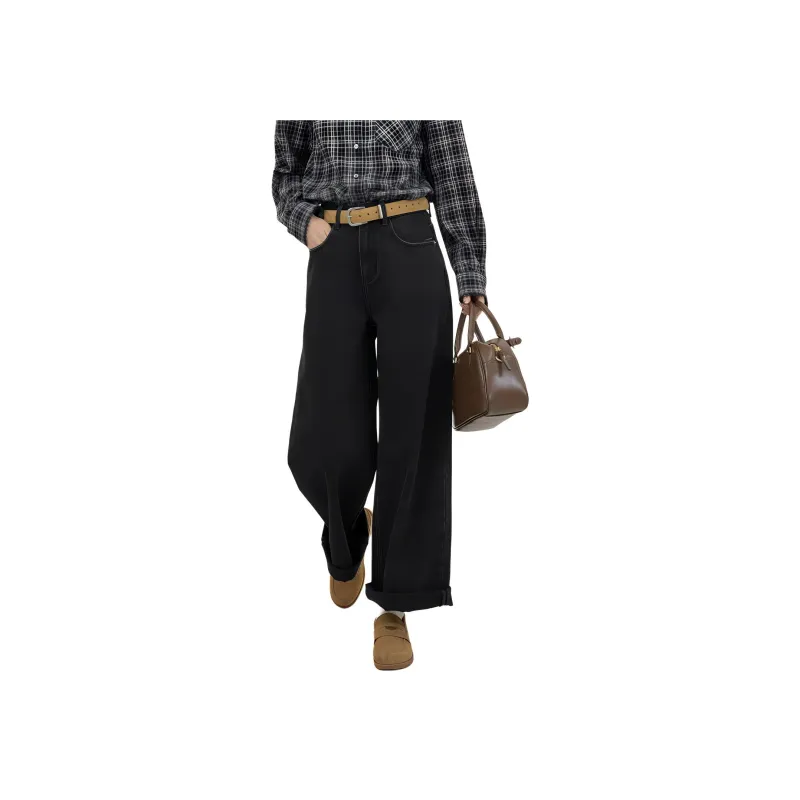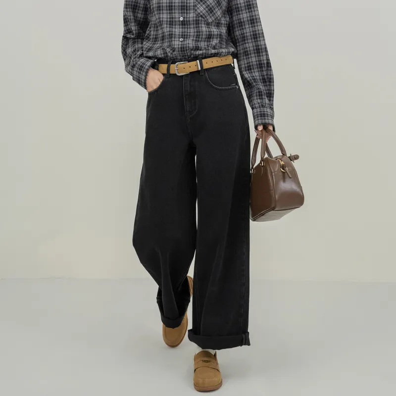 Fstudio Корейский стиль Похудение Коммутирование Универсальный HIGH RISE Джинсы прямого кроя Женские Черный
