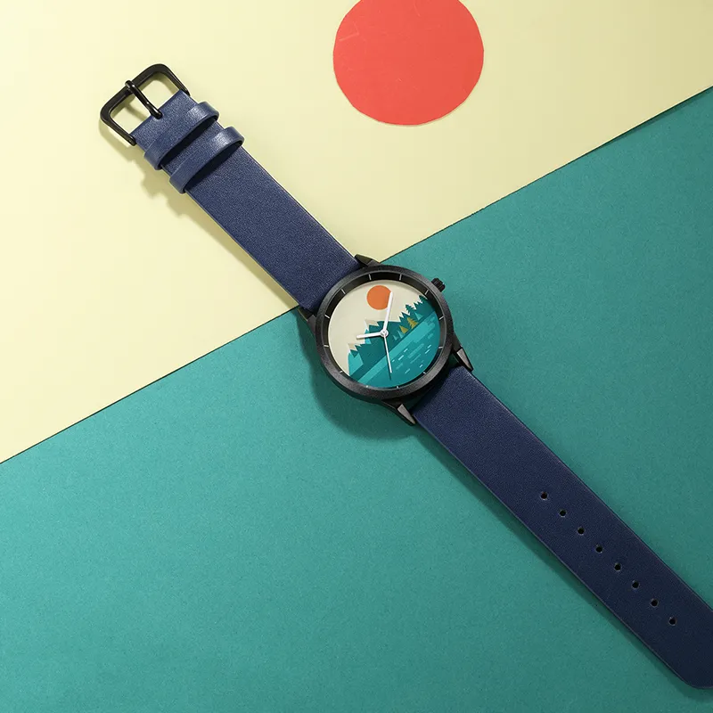 Funtime Rizhao Jinshan Series Кварцевый механизм Естественная кожа Ремешок Часы Унисекс Черный циферблат ART Snow Mountain
