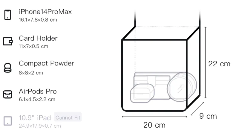 Верхняя длина (размер в длину): 20 см, нижняя длина: 25,5 см, ширина корпуса: 9 см, длина корпуса: 22 см