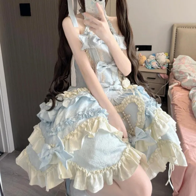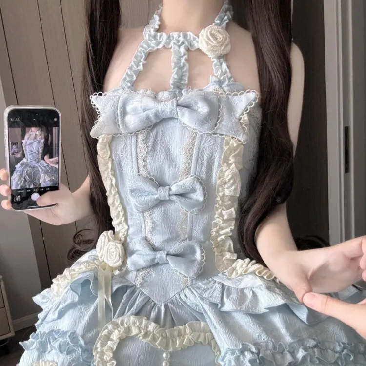 Синий халтер, стиль позиционирования (включает хвост платья + бант)