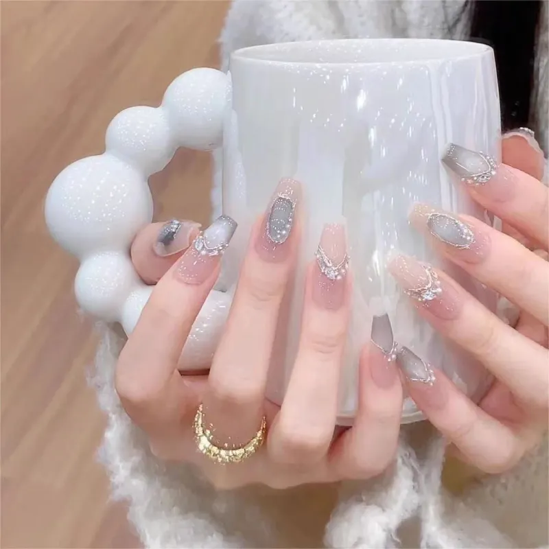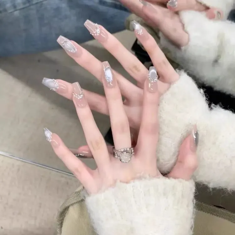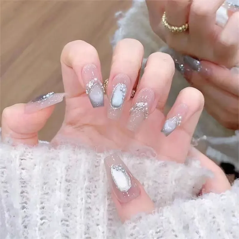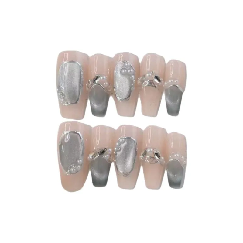 Gentle Welcome Звезды Dream Сверкающий страз Pearl False Nail Средний LADDER Телесный Silver White Smudge Кошачий глаз