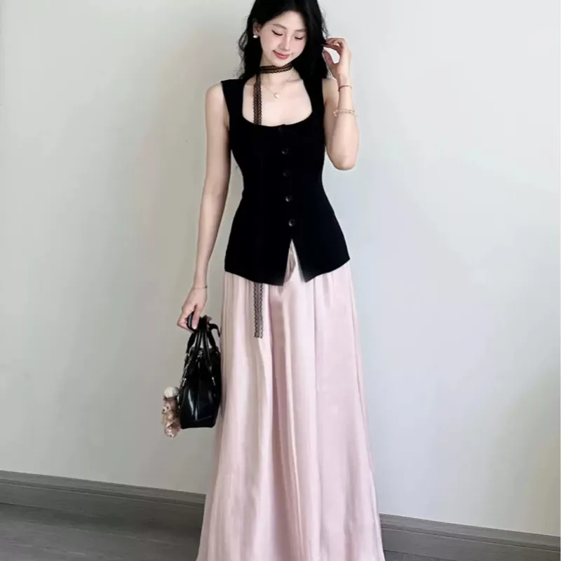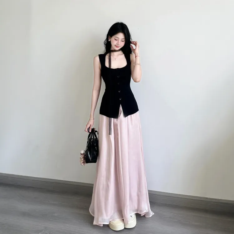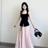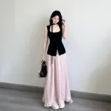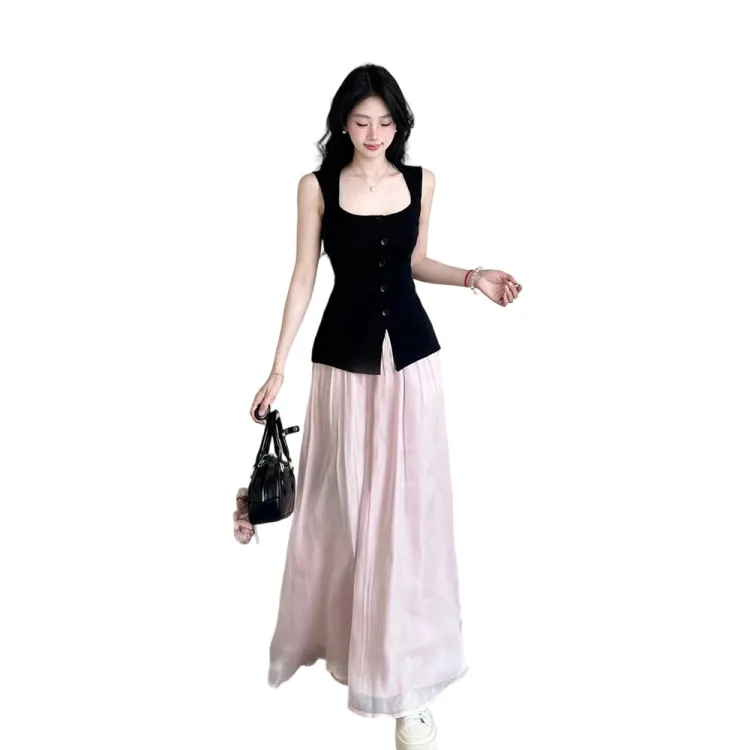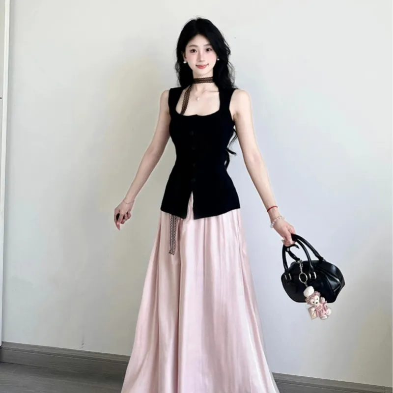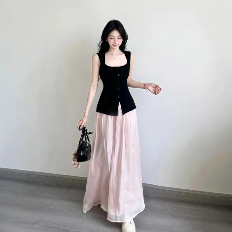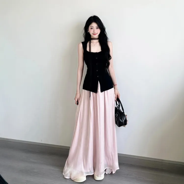 Чёрный топ + Розовая юбка