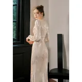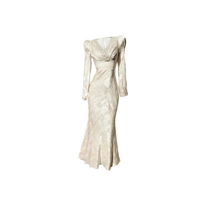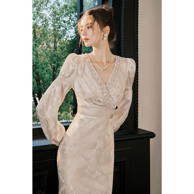 GJFD Французский Премиум С утяжкой на талии Похудение Длинный Sleeved Платье Женские Сандаловое дерево Снег