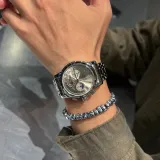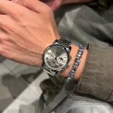 Серебряный корпус с черным циферблатом.