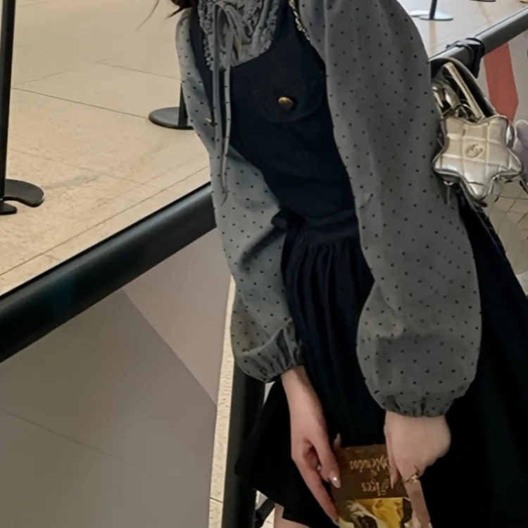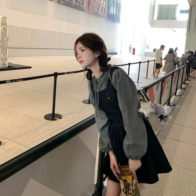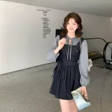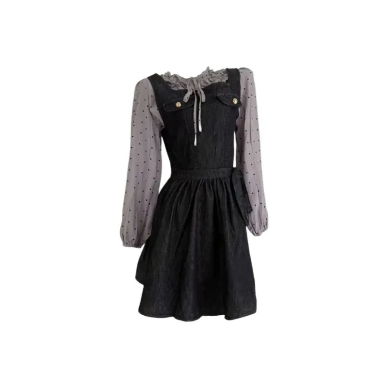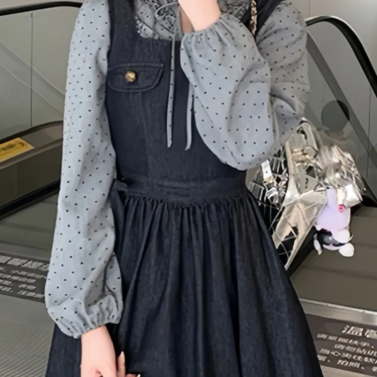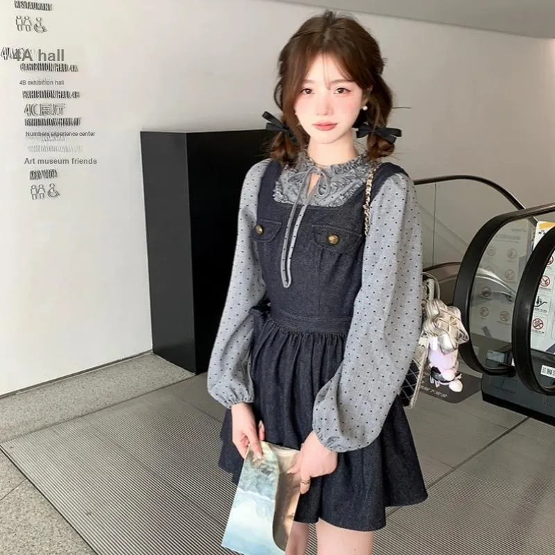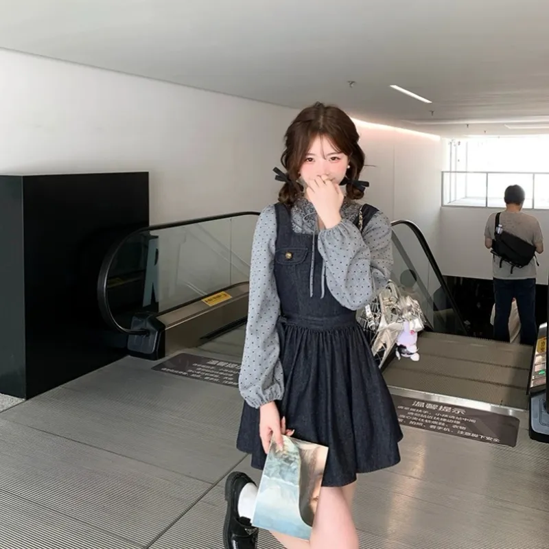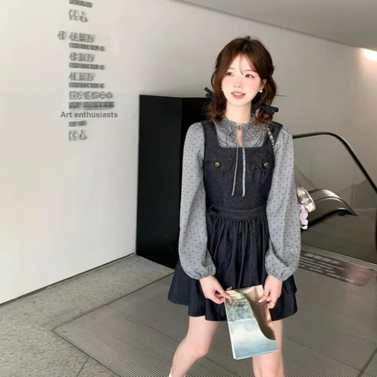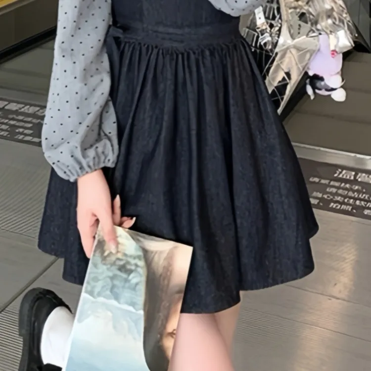 GORGEOUSIDEA Серый топ + Деним юбка на подтяжках Женские комплекты с юбкой