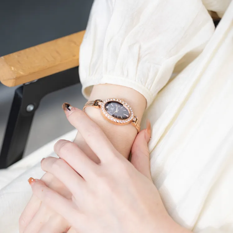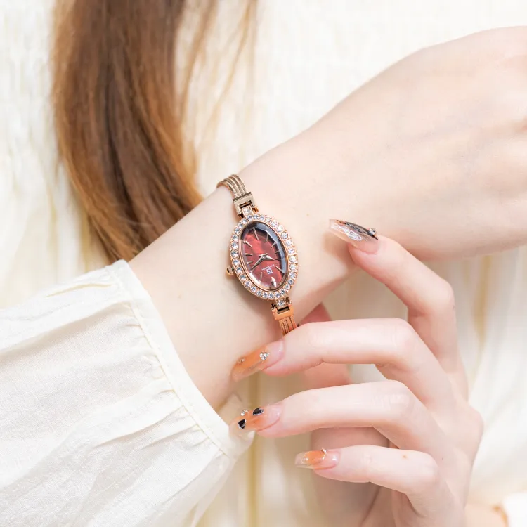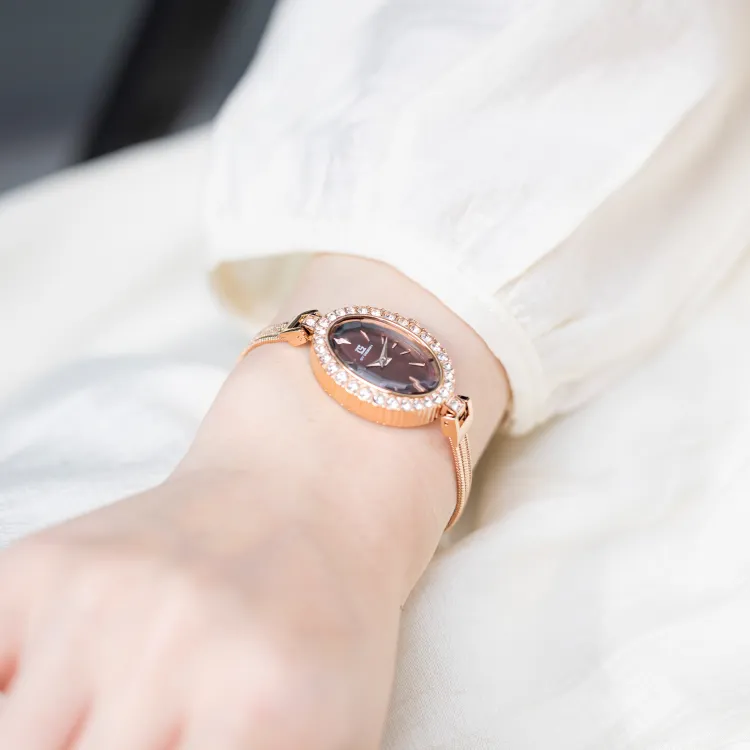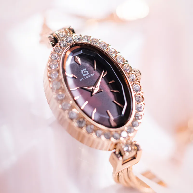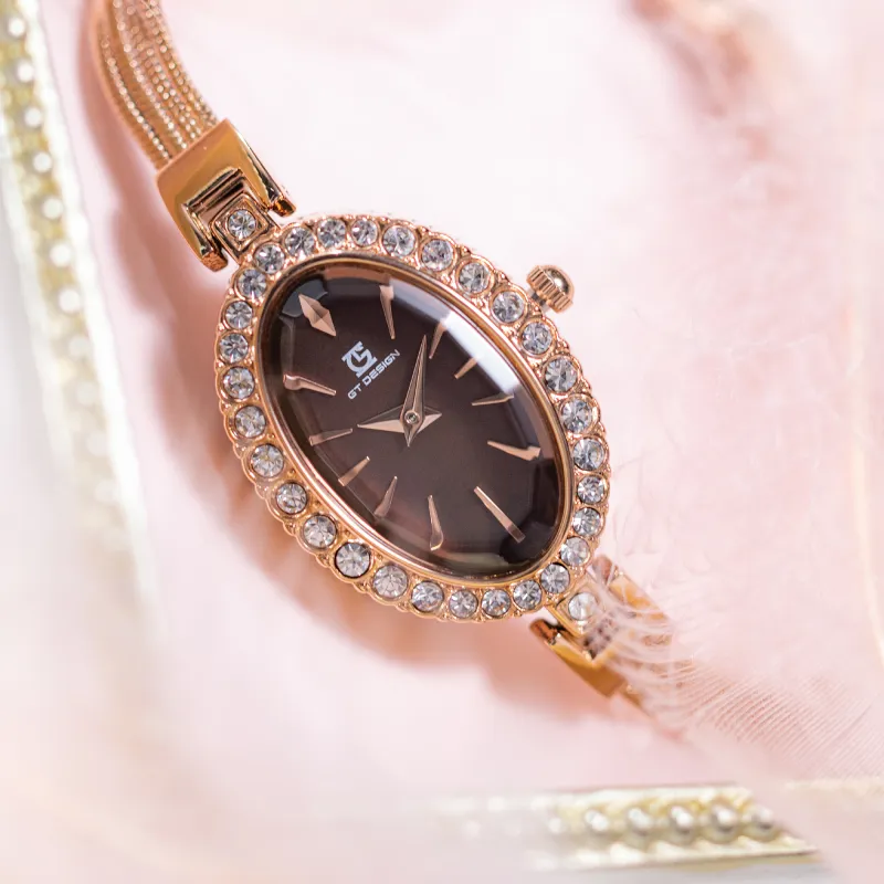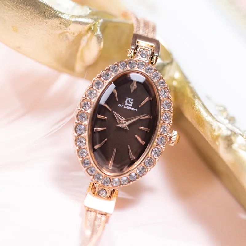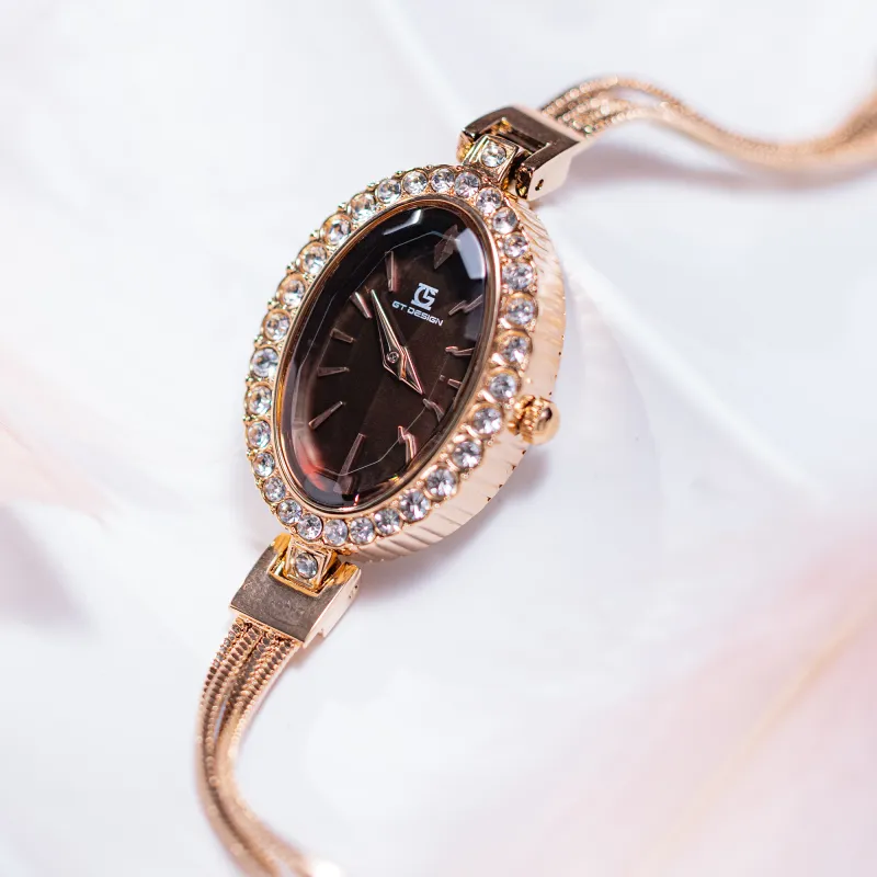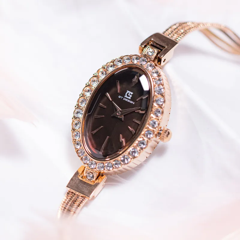 GT DESIGN Rhinestone Embellished Маленький Oval Кварцевый механизм Alloy Ремешок Часы Женские Часы Кофейный Циферблат Часов