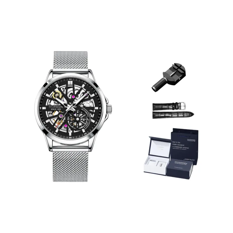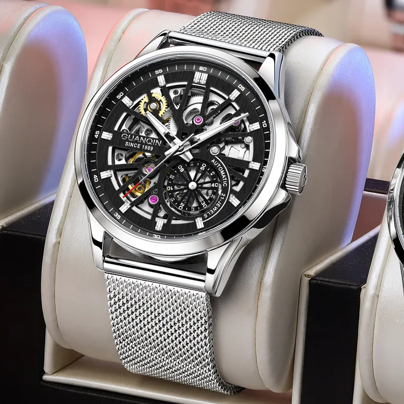 GUANQIN Автоматический механический механизм Сетчатый ремешок Часы Мужские часы Черепный циферблат