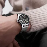Комплект:Серебряный корпус с черным циферблатом, сетчатая сумка (включает открывалку для часов, коробку + кожаный ремешок)