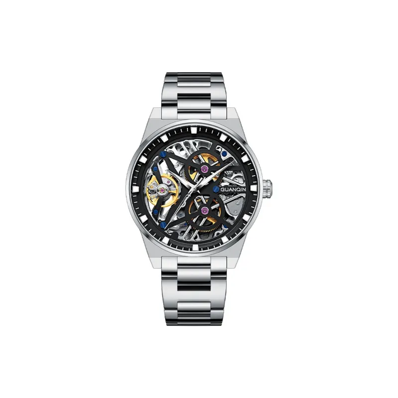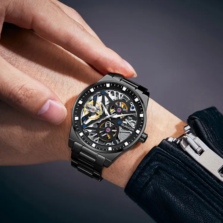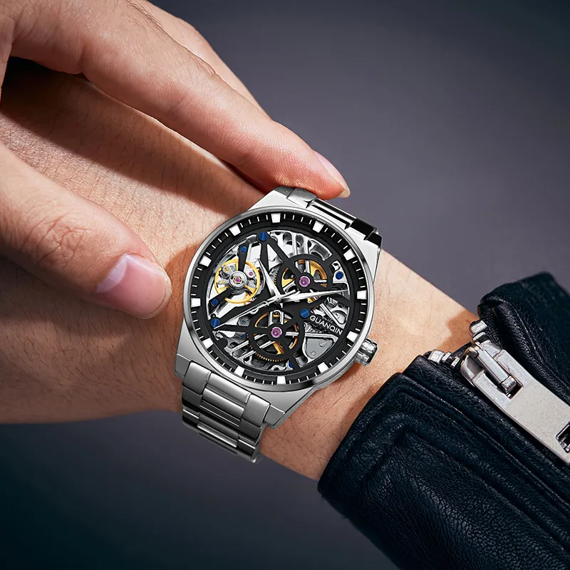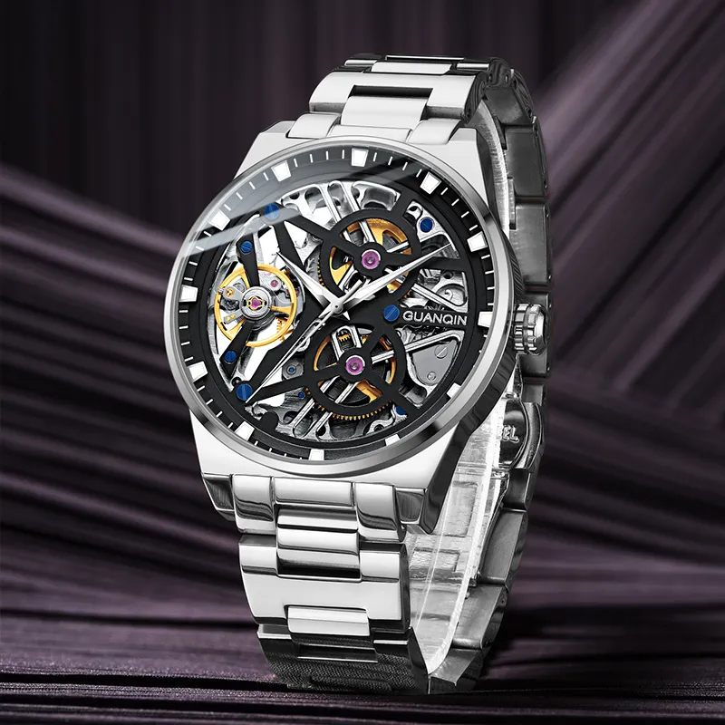 GUANQIN GJ16350 Механический механизм ремешок из нержавеющей стали черный циферблат мужские часы