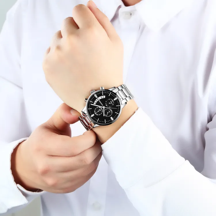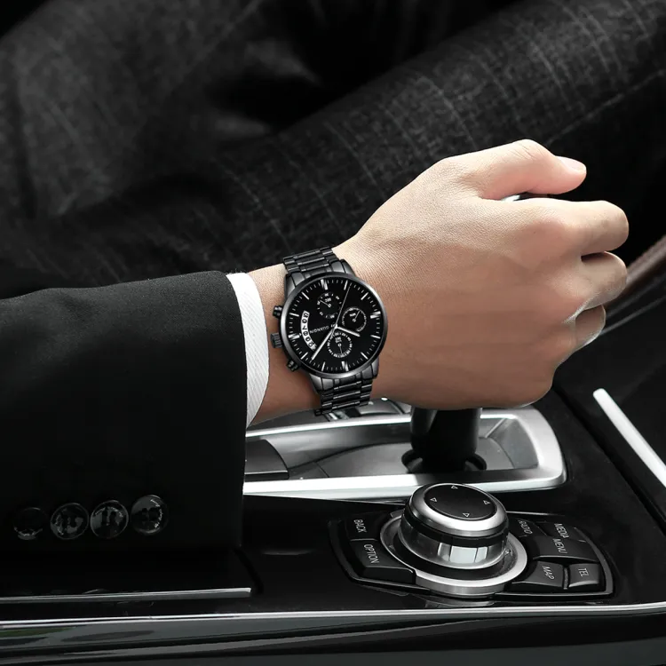 Черный корпус, черный циферблат, стальной ремешок