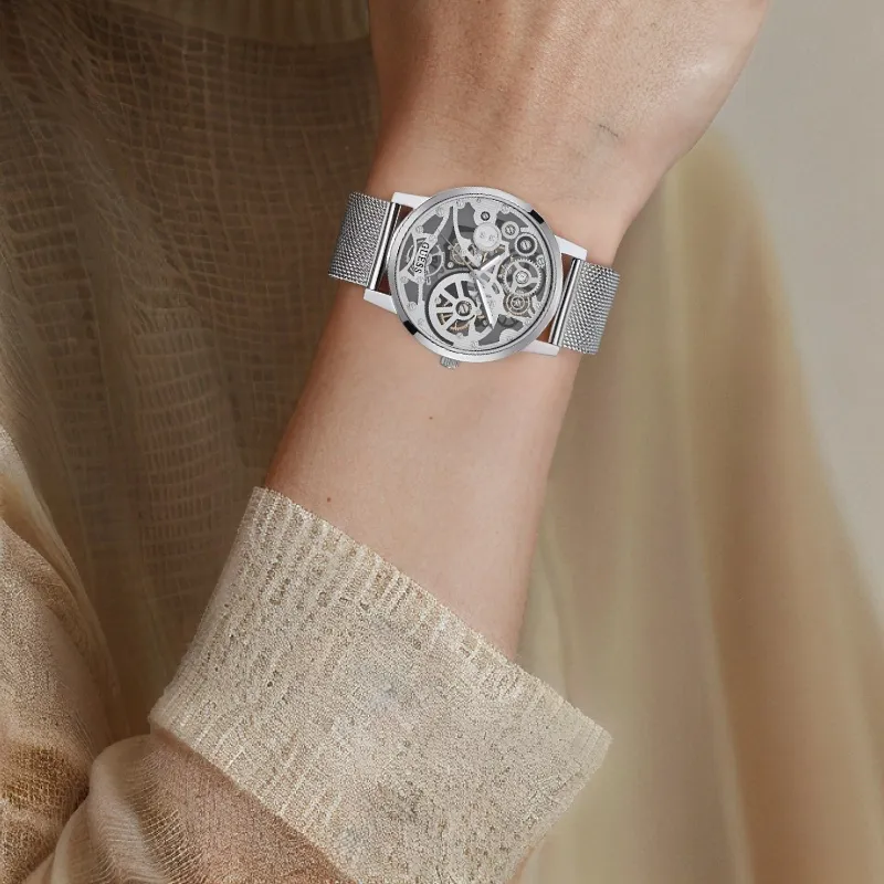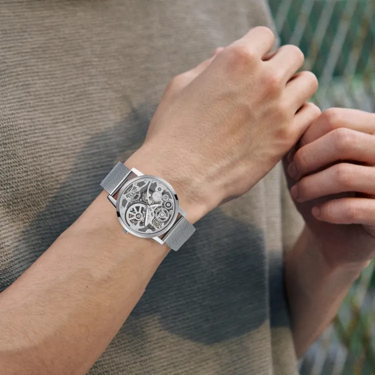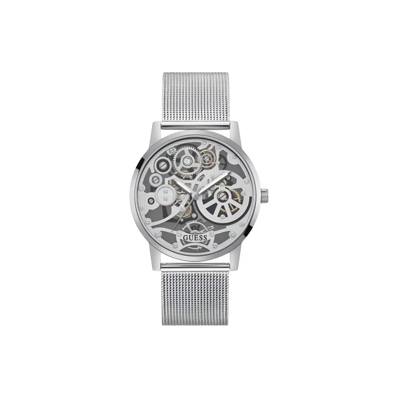 GUESS Мужские часы Кварцевый механизм Ремешок из нержавеющей стали 42 мм Циферблат с дизайном Skeleton Часы
