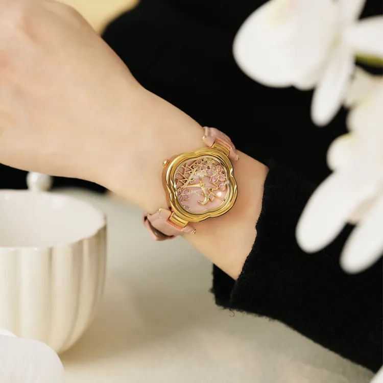 Розовый ремешок с золотым циферблатом и пудровым оттенком