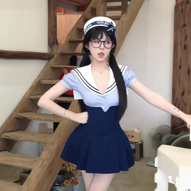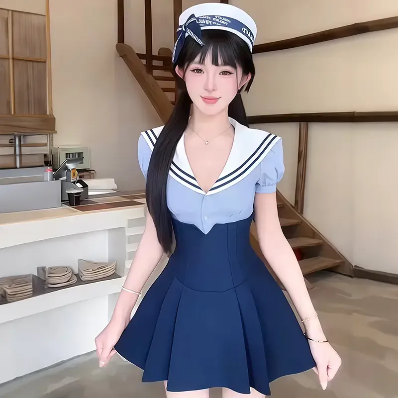 Синие полосы Топ + Темно-синяя Юбка