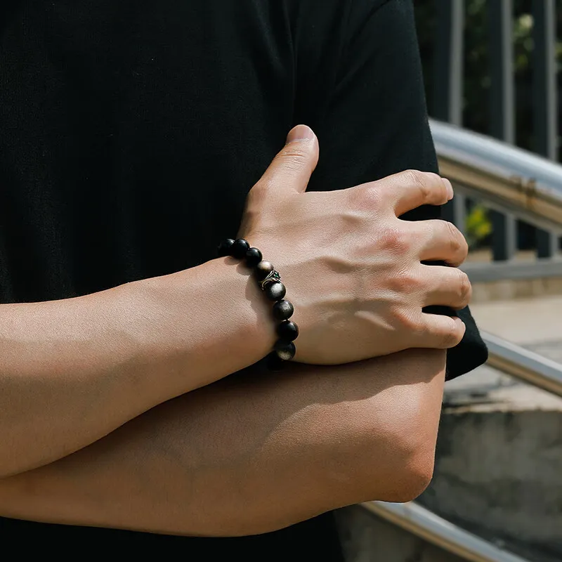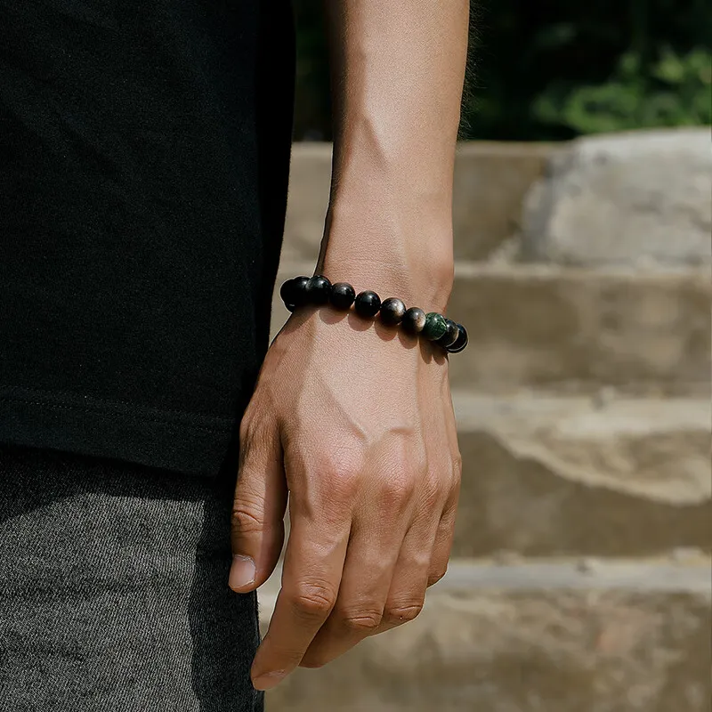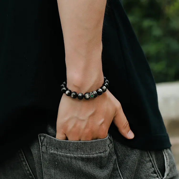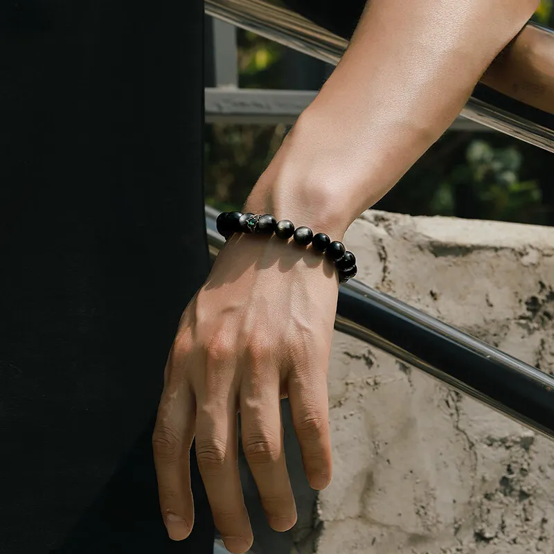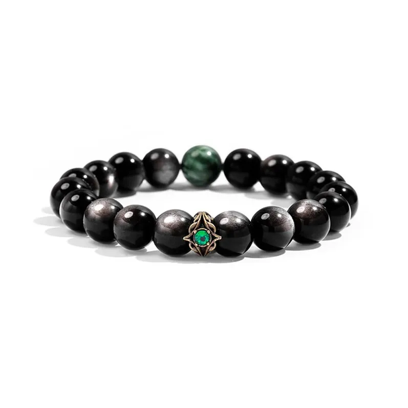 Стиль:[10 мм с Национальным Сертификатом Тестирования] Серебряный Блестящий Обсидиан Зеленый Дракон Кристальный Браслет с Бусинами