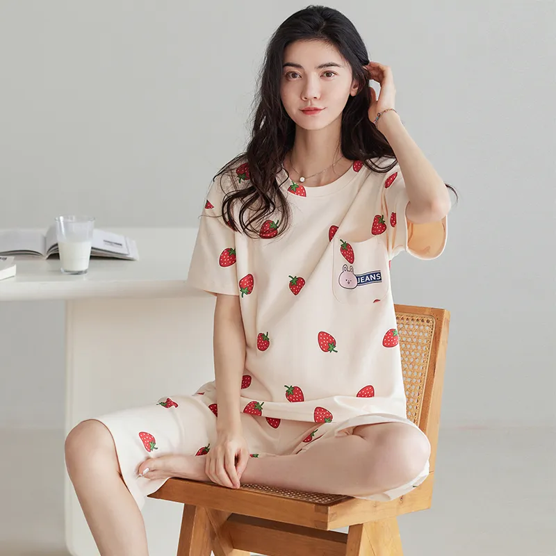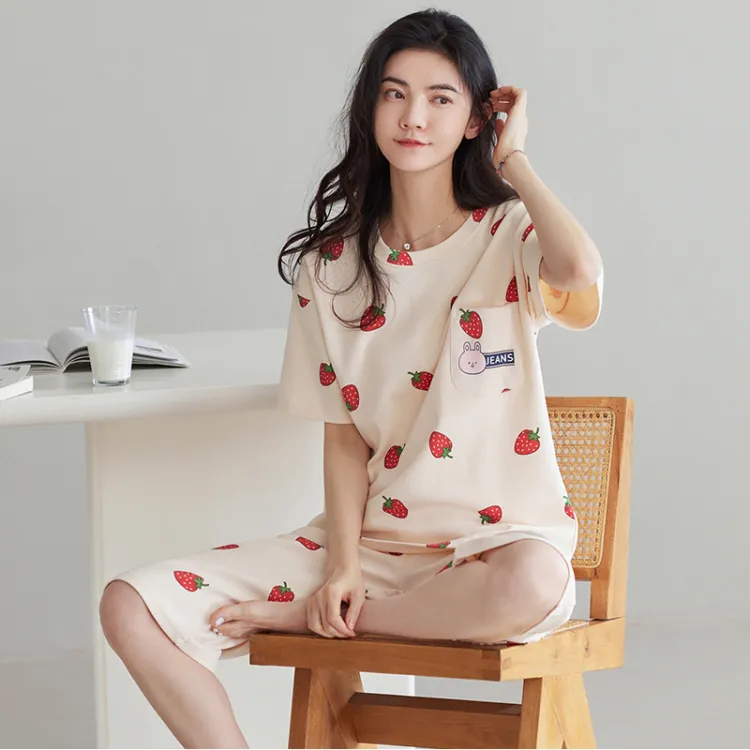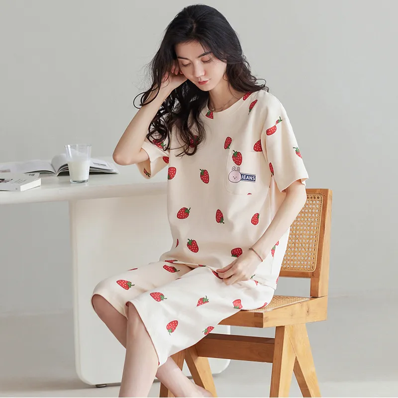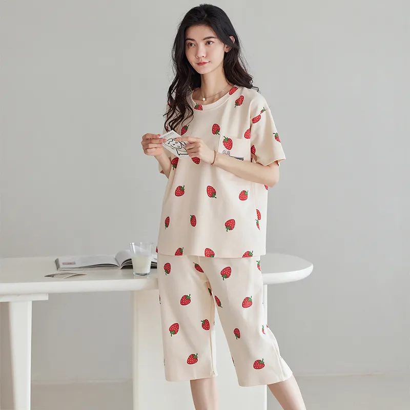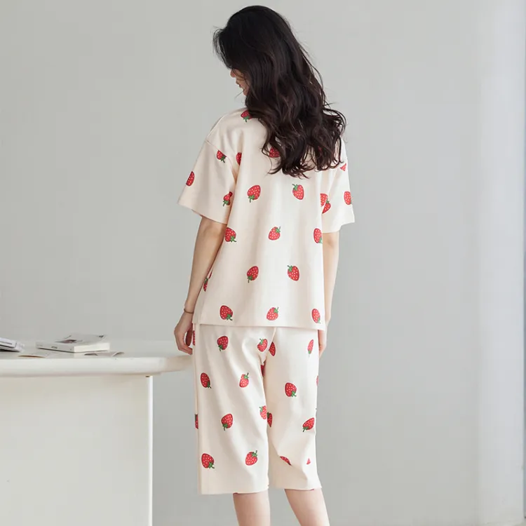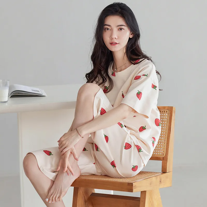 HUAJIDEGUSHI Strawberry Women's Summer Thin Short-Sleeved Capri Pants Cute Students Instagram Style Loungewear Set