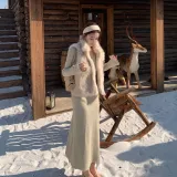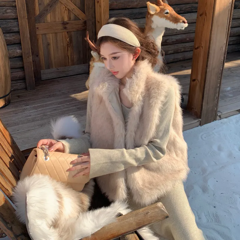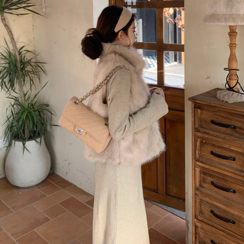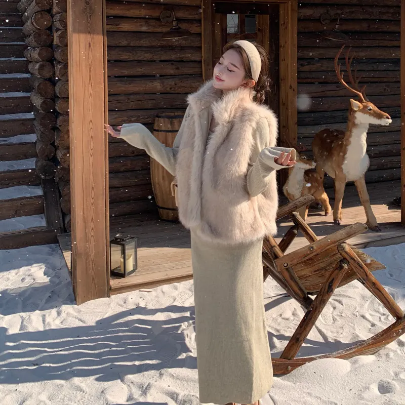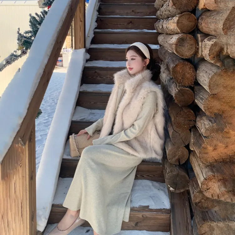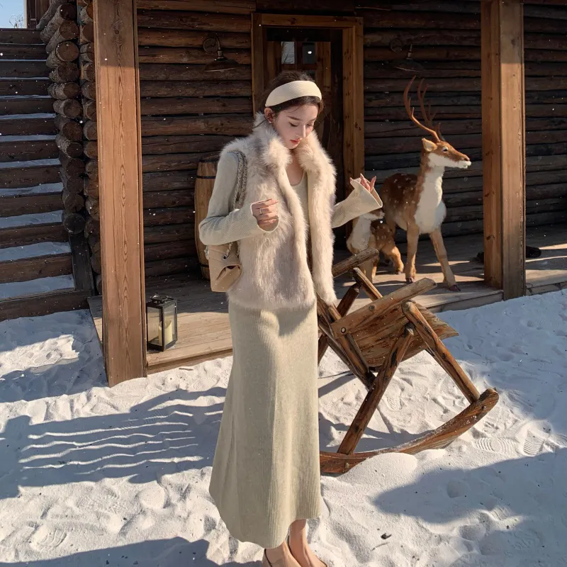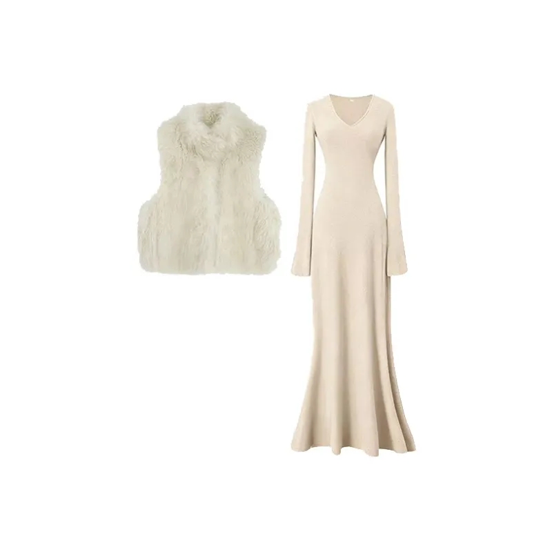 Комплект:Элегантность Одежда Комплекты (Меховый жилет + Овсяное платье)