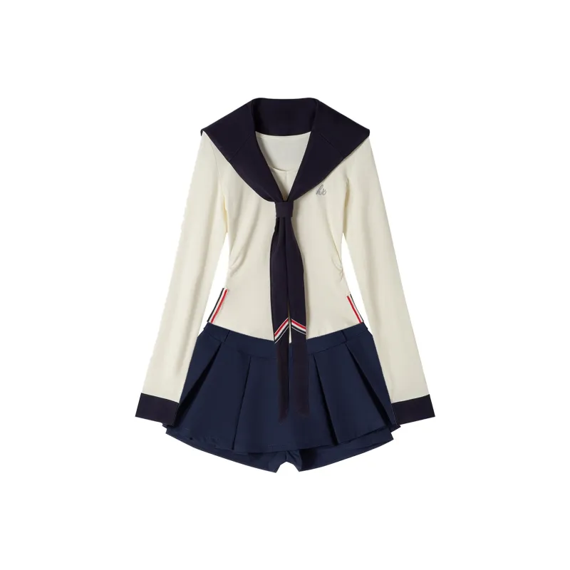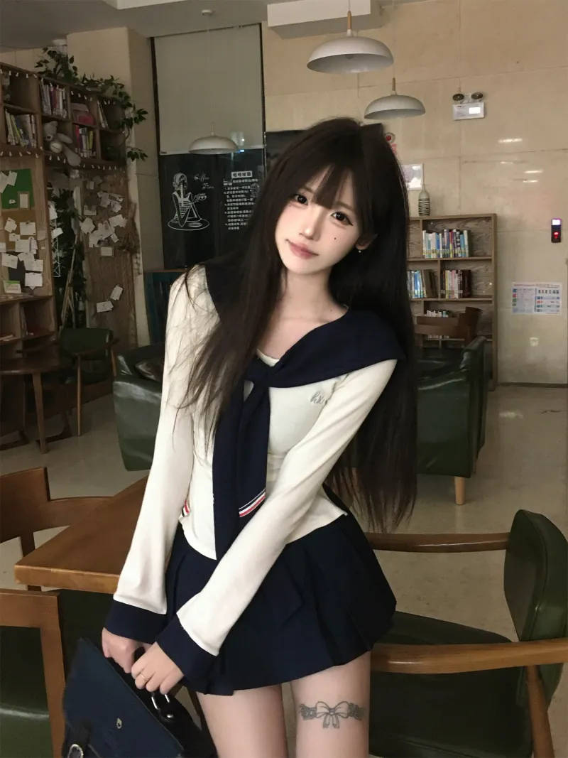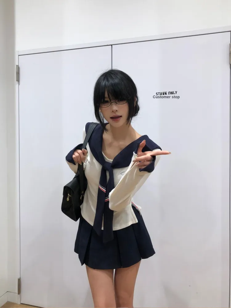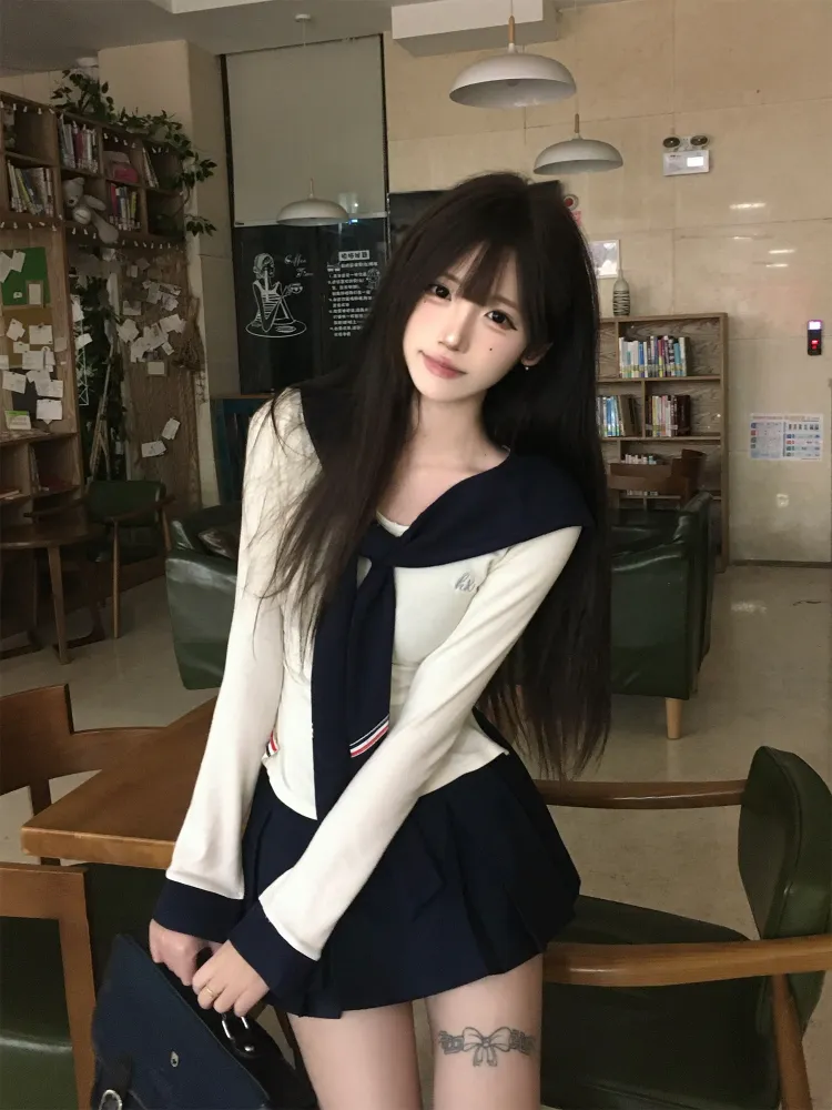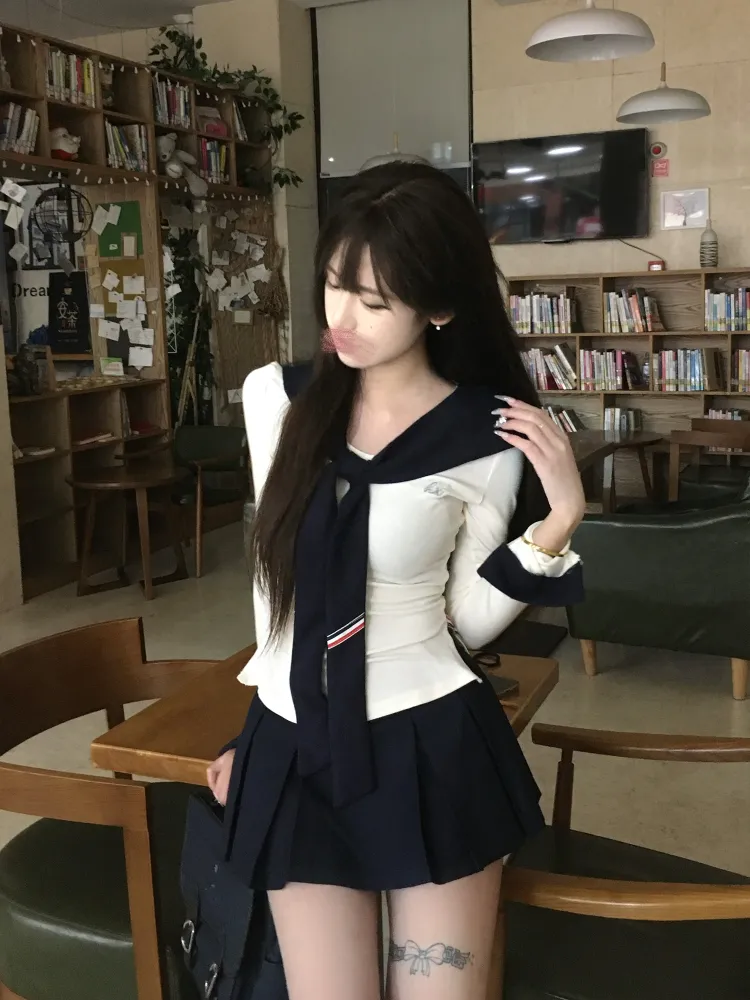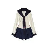 Морской стиль, девичий, темно-синий, длинный рукав, топ + белая шаль + морской стиль, короткая юбка