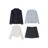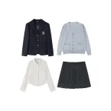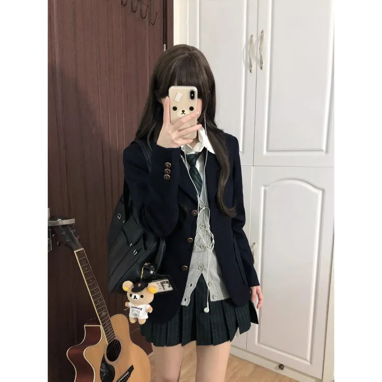 Корейский стиль Темно-синий костюм + Бамбук окрашенный клетчатая юбка + Светло-серый кардиган + Девичий стиль рубашка + Зеленый галстук