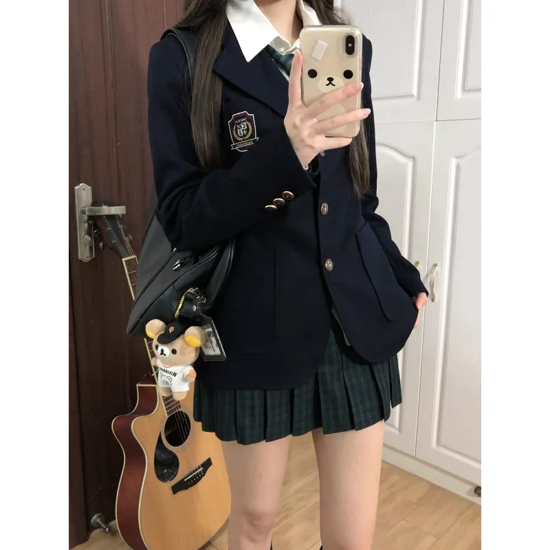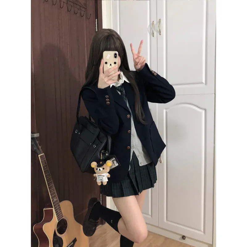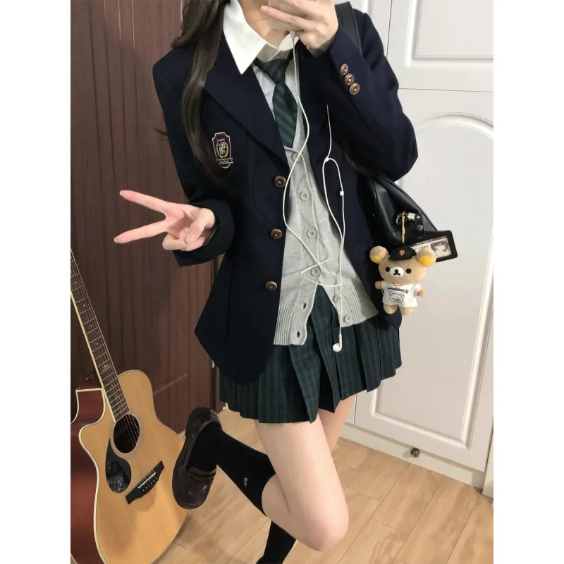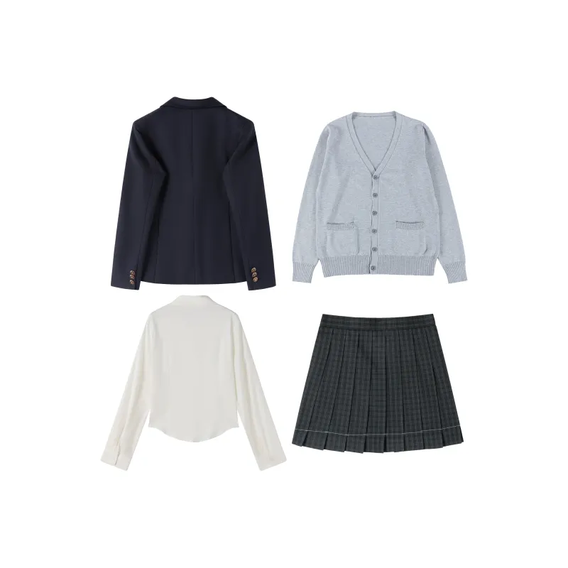 Комплект:Корейский стиль Темно-синий костюм + Бамбук окрашенный клетчатая юбка + Светло-серый кардиган + Девичий стиль рубашка + Зеленый галстук