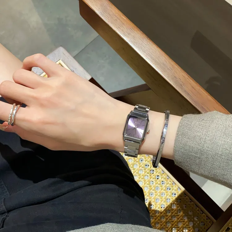Серебряный корпус, фиолетовый циферблат.