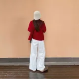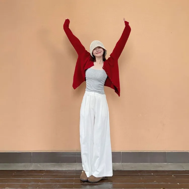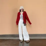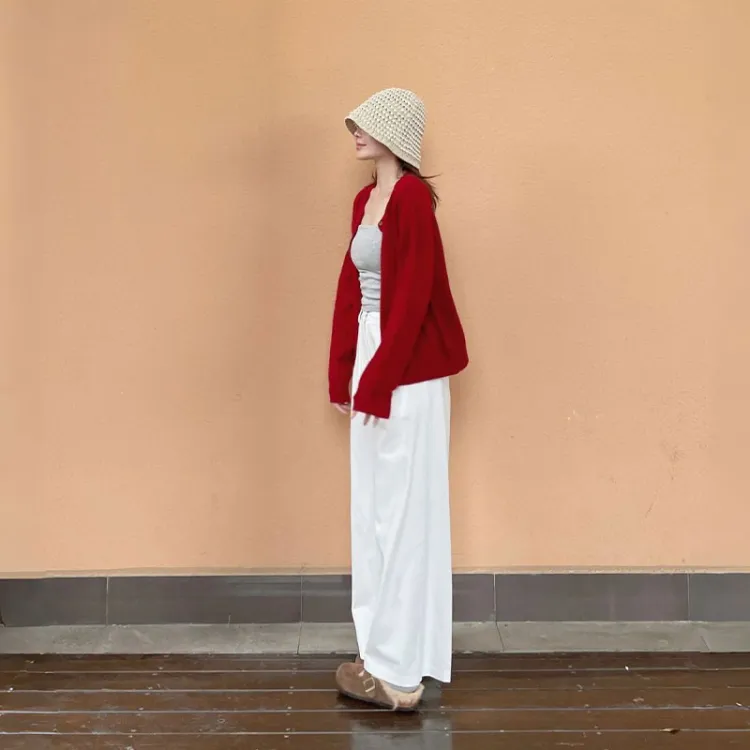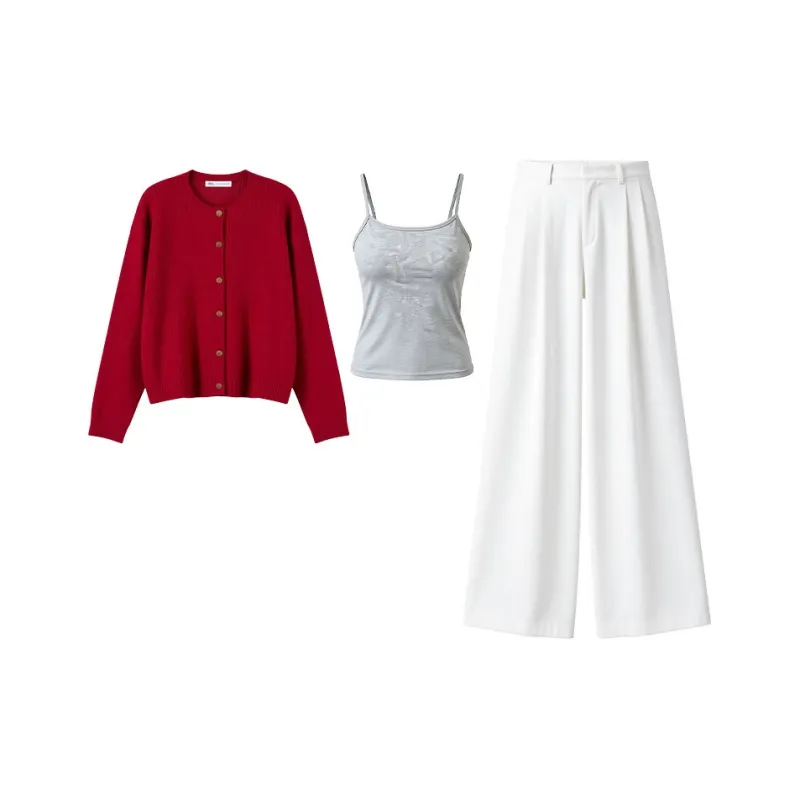 Красный кардиган + топ на бретелях + широкие штаны [трехкомпонентный комплект]