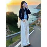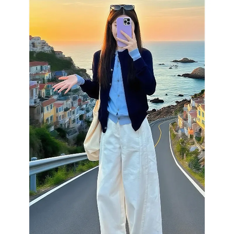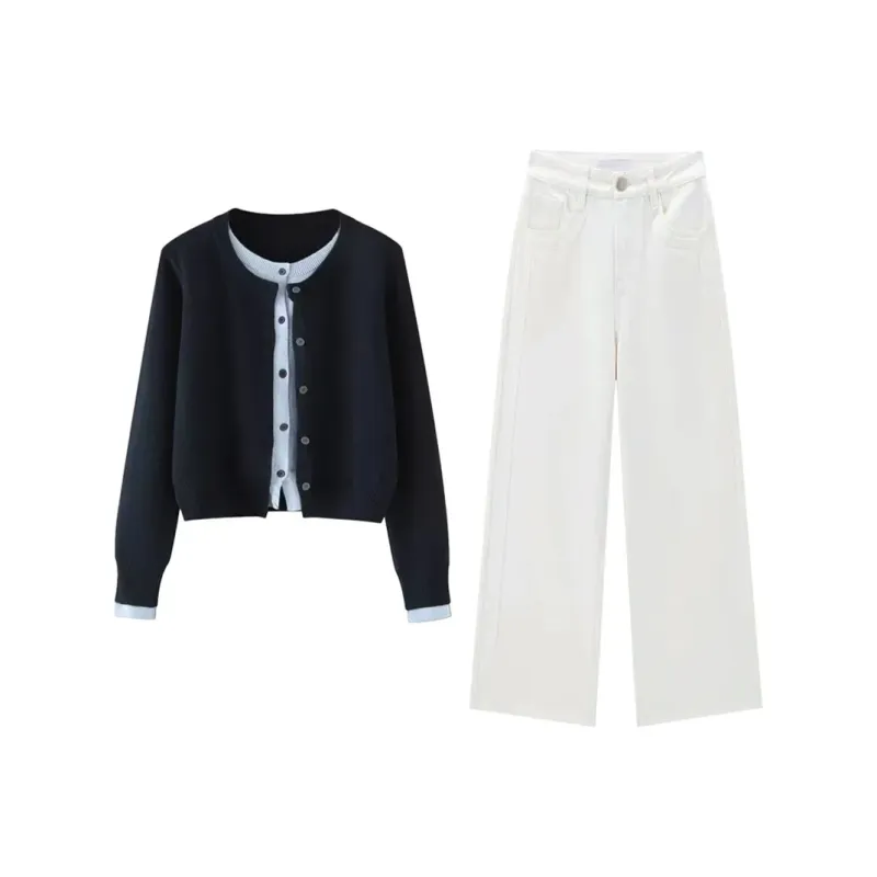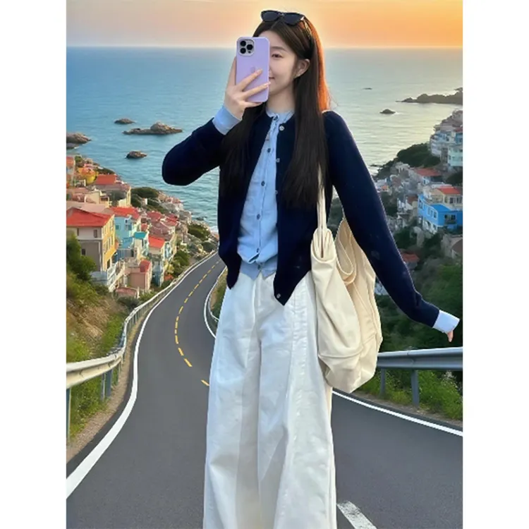 Темно-синий и синий топ + белые штаны