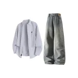 Светло-серый топ + синие штаны