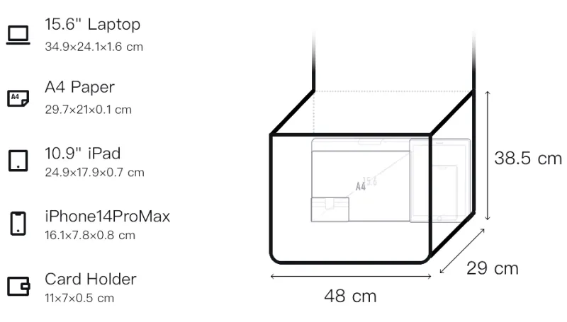 48 см в длину, 29 см в ширину, 38,5 см в высоту